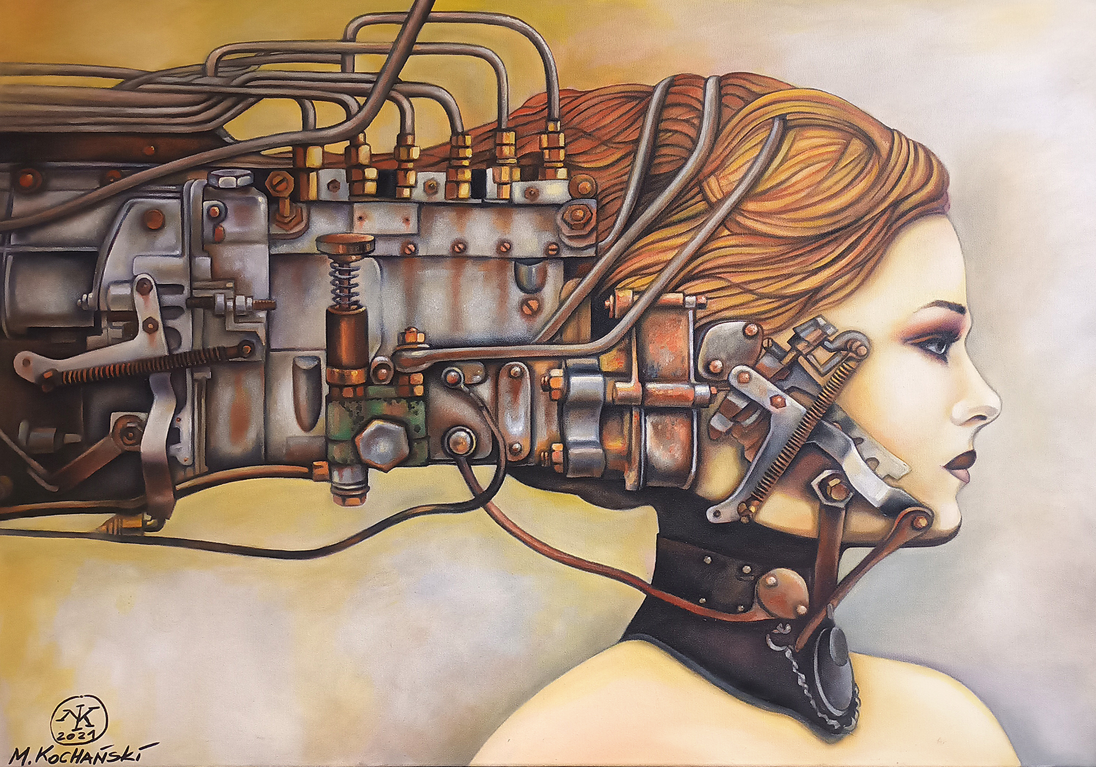 Prezentowana praca ukazuje hybrydę człowieka i maszyny, balansującą na granicy portretu, futuryzmu i refleksji filozoficznej. Artysta zestawia delikatny, realistycznie oddany profil kobiecej twarzy z rozbudowanym, industrialnym mechanizmem, który zastępuje tylną część głowy. Motywy przewodów, tłoków i metalowych połączeń tworzą wizualną metaforę współczesnej kondycji człowieka — istoty zanurzonej w technologii, zależnej od systemów, które jednocześnie wzmacniają i determinują jej tożsamość. Dzieło wpisuje się w nurt posthumanizmu oraz estetykę biomechaniczną, przywołując pytania o granice człowieczeństwa, autonomię umysłu i cenę postępu technologicznego. Kontrast pomiędzy ciepłą kolorystyką skóry i włosów a chłodną, ciężką formą maszynerii potęguje napięcie emocjonalne kompozycji. Obraz nie daje jednoznacznych odpowiedzi — zamiast tego zaprasza widza do kontemplacji przyszłości, w której ciało, umysł i technologia stają się jednym organizmem. Profil kobiety jest spokojny, niemal klasyczny — zamknięty w ciszy i skupieniu. Jednak za tą ciszą kryje się potężna konstrukcja: maszyna wrośnięta w czaszkę, pulsująca energią, odpowiedzialna za pamięć, myśli i decyzje. Metalowe elementy nie są agresywne — wydają się organiczne, jakby należały tam od zawsze. Praca opowiada o ewolucji świadomości. O momencie, w którym człowiek przestaje być wyłącznie biologiczny, a staje się projektem — złożonym, modyfikowalnym, zależnym od technologii. Mechaniczna głowa nie odbiera postaci człowieczeństwa, lecz je redefiniuje. To obraz transformacji, nie utraty. Jest w nim jednocześnie fascynacja i niepokój. Piękno i ciężar. Przyszłość, która już się zaczęła.