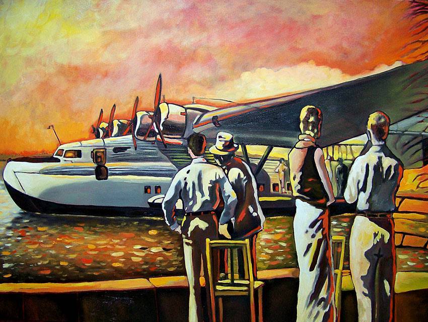 Obraz ukazuje malowniczy zachód słońca nad rzeką, gdzie na pierwszym planie widzimy grupę osób patrzących na duży hydroplan cumujący przy brzegu. Dominują ciepłe kolory: pomarańcze, żółcie i złote odcienie tworzące nostalgiczną atmosferę końca dnia. Chmury nad horyzontem wyglądają jakby były namalowane pędzlem pełnym emocji, nadając głębi kompozycji. Podniebny gigant wydaje się być w stanie spoczynku, jakby oczekiwał na przygodę. Postacie na obrazie są odwrócone, co daje wrażenie niepokoju i tajemnicy. Koleś w kapeluszu wydaje się mówić: "Wow, ale czad!". Styl artystyczny przypomina impresjonizm z domieszką art deco, z wyraźnymi konturami i płynnością form. Odbiorca może poczuć tęsknotę za minioną epoką podróży i odkrywania nieznanego. Uczucie to jest jak wołanie "adventure". Obraz kusi do zastanowienia się nad ulotnością chwili. Patrząc na to dzieło, odczuwa się ciepło i spokój, ale też chęć bycia częścią tego momentu. Dzieło sprawia, że myślisz o minionych czasach, kiedy podróż samolotem była czymś magicznym.