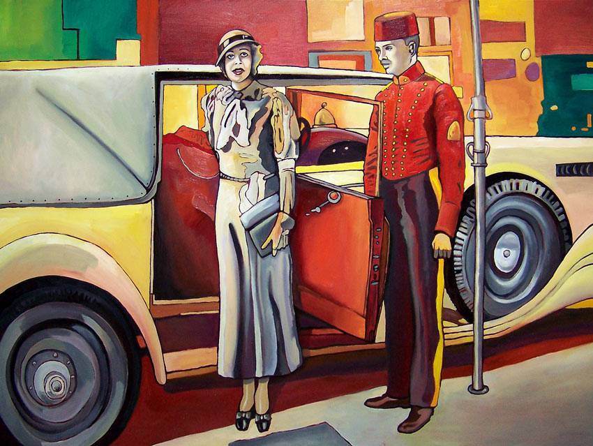 Obraz tchnie elegancją i nostalgicznym urokiem dawnych lat. Bogata paleta barw o ciepłych odcieniach jak czerwienie, pomarańcze oraz żółcie dominuje nad całym dziełem, nadając mu przyjazny, choć nieco retro charakter. W centralnym punkcie widzimy damę w wytwornej sukni, która jakby właśnie wysiadła z luksusowego auta. W tle, zamaszyste plamy koloru tworzą abstrakcyjny, nieco kubistyczny krajobraz miasta. Nastrój obrazu jest jednocześnie dystyngowany i lekko humorystyczny. Artysta operuje tu płynnymi liniami, a jednocześnie pewną naiwnością formy, co intryguje i bawi. Sposób, w jaki kolory przechodzą jeden w drugi, nadaje mu dynamiki, a jednocześnie sprawia, że mamy wrażenie, jak gdybyśmy oglądali scenę z oldschoolowego filmu. To one moment in time, który wywołuje wspomnienia o dawnych latach. "Ale fajne auto!" - powiedziałoby dziecko, patrząc na to. Emocje nasuwają się same, być może tęsknota za minioną epoką, w której było więcej czasu na taką elegancję. Obraz może budzić refleksje o przemijaniu i elegancji codzienności zatrzymanej w kadrze. Fascynuje i każe się zatrzymać choć na moment, by cieszyć się chwilą.