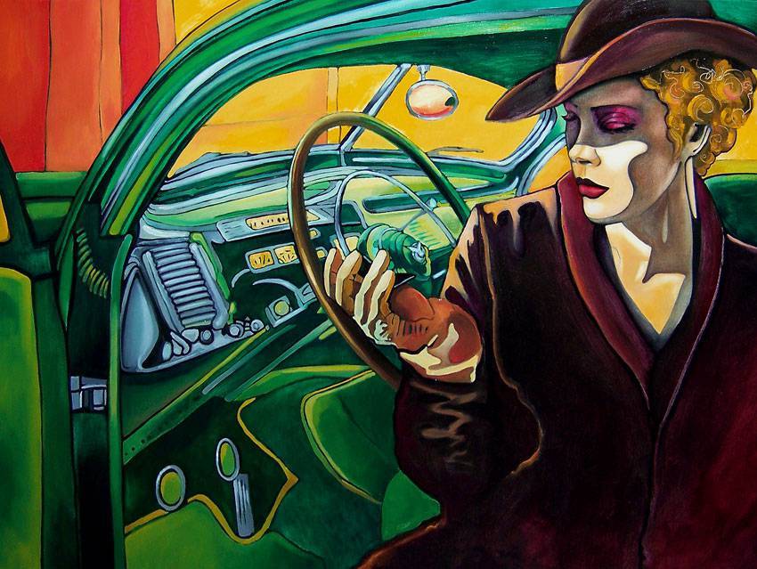Obraz jest pełen kolorów, głównie zieleni i żółci, które wprowadzają intensywną, energetyczną atmosferę. Kobieta w kapeluszu, z wyrazem skupienia na twarzy, trzyma coś w dłoni, co dodaje tajemniczości. Samochód w tle, z wyraźnymi konturami, jest jak ze starego filmu – almost like a classic noir scene. To połączenie sztuki pop-artu z surrealistycznym klimatem. Artysta bawi się kontrastem, używając grubych linii i ostrych kształtów, co sprawia, że wszystko jest jakby lekko wypukłe. Nastrój obrazu jest trochę zagadkowy, może nawet melancholijny. Może myślała: „Dokąd jadę tym life-car?” Wzrok tej kobiety, nieco zamyślony, może sugerować refleksję. Może to chwila zatrzymania, moment skupienia przed ważną decyzją. Czuję, że każdy z nas, patrząc na tę scenę, może zobaczyć kawałek własnej podróży. Dziecko powiedziałoby pewnie: „Patrz, pani ma fajny kapelusz!” Ciekawi mnie, co tak naprawdę trzyma w ręku, a Ty?