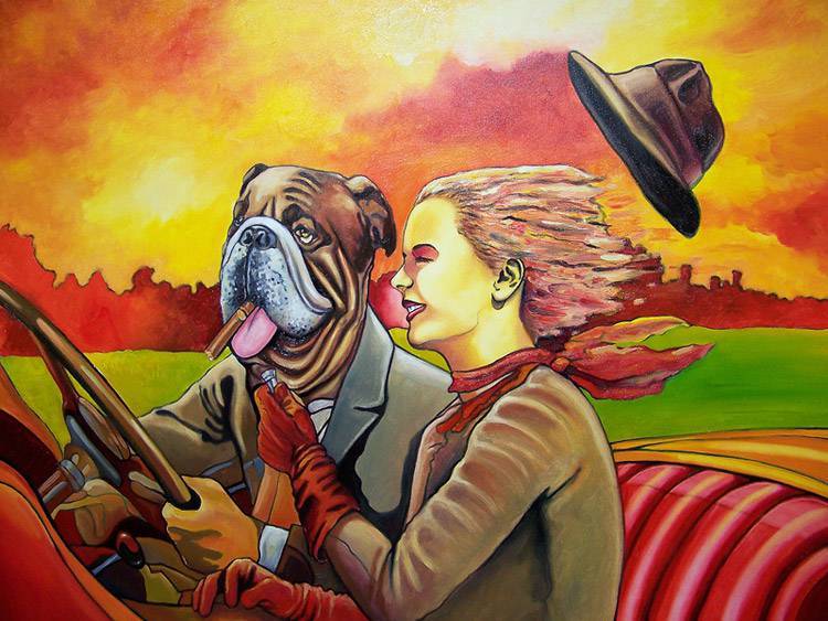 Obraz emanuje energią i dynamizmem, pełen jest intensywnych kolorów. Tło płonie jaskrawymi odcieniami pomarańczu i żółci, przypominając eksplozję zachodzącego słońca. W centrum kompozycji siedzi nietypowa para—człowiek i buldog—w starym samochodzie, który wydaje się sunąć z niesamowitą prędkością. Ich włosy i uszy powiewają na wietrze. Kobieta wygląda na zrelaksowaną, a pies z cygarem w pysku jest pełen pewności siebie. To jest surrealism w pełnej krasie. Atmosfera tego obrazu jest nieco komiczna, a jednocześnie nostalgiczna. Styl malarski artysty przypomina nieco komiksowy, z mocno zarysowanymi konturami postaci, co dodaje mu charakterystycznej lekkości. Mamy tu też elementy humoru—mam psa za kierownicą, który wygląda jak gentleman! Obraz skłania do refleksji nad związkiem człowieka i zwierzęcia oraz do zastanowienia się, jak często podejmujemy szalone decyzje w życiu. Moje serce się śmieje na ten widok. Children might say, "To wygląda jak bajka z psim kierowcą!". Całość wzbudza w nas uczucie wolności i beztroski—tak jakby ktoś nas zaprosił do szalonej przygody, gdzie niemożliwe staje się możliwe.