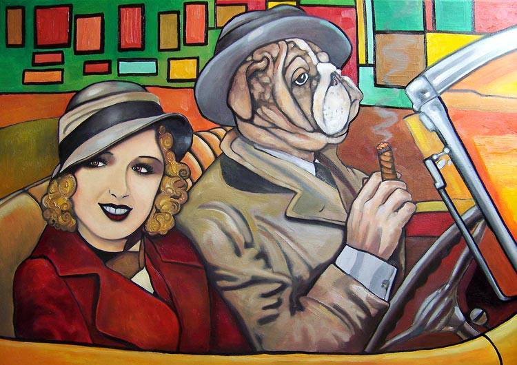 Na obrazie widać dwie postacie siedzące w samochodzie. Tło jest kolorowe, pełne geometrycznych kształtów, które tworzą żywy, energetyczny klimat. Pierwsza postać, kobieta w kapeluszu, uśmiecha się promiennie, a jej blond loki dodają jej uroku. Obok niej siedzi pies z twarzą buldoga ubranego w elegancki płaszcz i kapelusz, trzymający cygaro. To zaskakujące zestawienie nadaje obrazowi humorystyczny wydźwięk. Kolorystyka dzieła jest intensywna, dominują czerwienie, zielenie i żółcie, co przyciąga wzrok. Styl artystyczny przypomina kubizm, z dużą ilością prostych form i kątów, ale jest też bardzo ekspresyjny. Sposób, w jaki artysta przedstawił postacie, jest nieco karykaturalny, niemal jakby chciał nas rozbawić. I to się udaje! Obraz emanuje nostalgią, przenosząc widza do ery jazzy, gdzie nonszalancja i elegancja szły w parze. Ta scena jest jakby wyjęta z jakiegoś old-fashioned filmu. "Ten pies wygląda jak mój wujek!", mogłoby powiedzieć 7-letnie dziecko. Obraz może budzić różnorodne emocje. U mnie wywołuje uśmiech i lekkie zdziwienie. Ciekawi mnie, co myśli ten pies? Czy może jedzie na ważne spotkanie? A może właśnie wracają z udanej przygody? Elementy zaskoczenia i zabawy sprawiają, że ta ilustracja jest zarówno intrygująca, jak i czarująca. To po prostu art in motion!