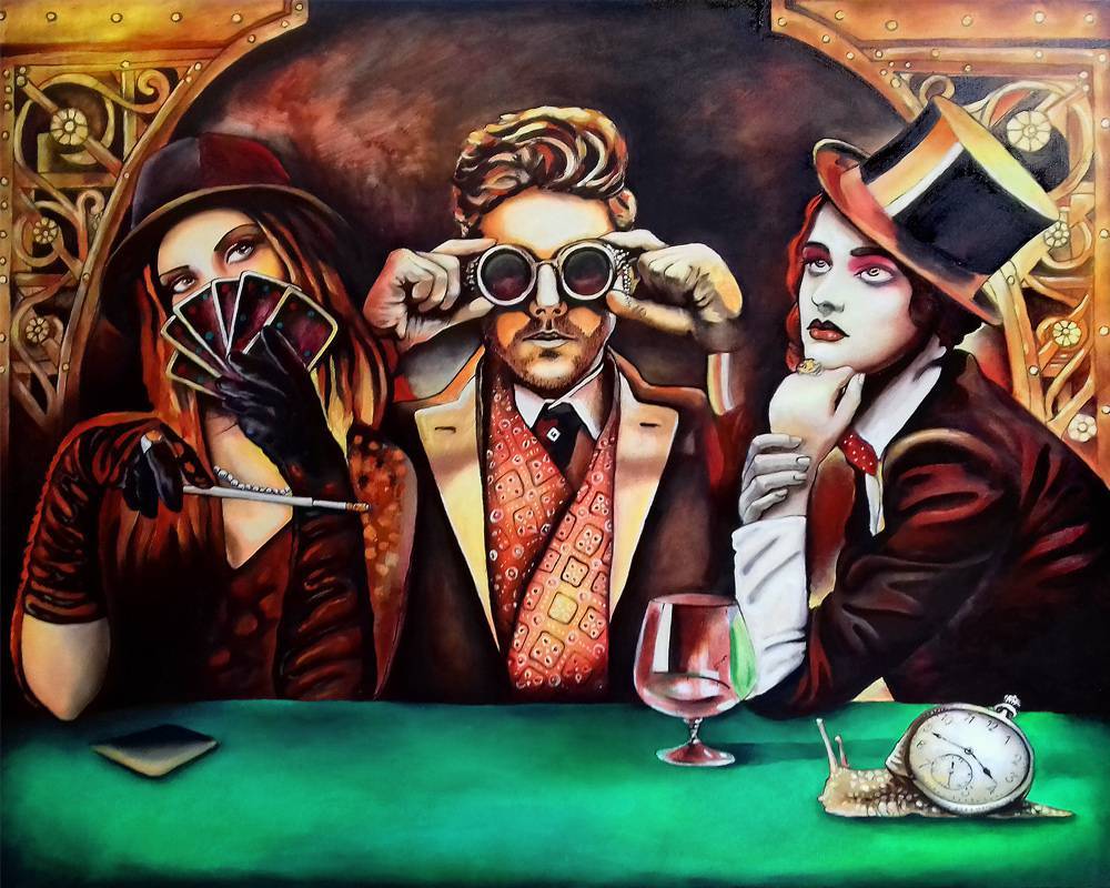Na obrazie zobaczymy trójkę postaci, każda z nich intryguje na swój sposób. Kobieta po lewej, skryta za wachlarzem kart, sugeruje tajemnicę, a może i podstępek. Mężczyzna w centrum z goglami wygląda jak postać z innego czasu, przypominająca miłe wspomnienia z filmów science fiction. Kolory są ciepłe, przeważają odcienie czerwieni, brązu i zieleni, tworząc atmosferę nie z tej ziemi. Styl można by określić jako steampunkowy mix z nutką surrealizmu. Skojarzenia płyną same: to jak magiczny świat, w którym wszystko jest możliwe. Artysta użył olejnych farb, budując tekstury tak wyraźne, że aż czuć je pod palcami. Kompozycja jest przemyślana, choć niby chaotyczna. Patrząc na nią, można pomyśleć: "Wow, everybody's got a story". Czy ja bym się bał takiego spotkania? Może trochę, ale bardziej bym był ciekawy co dalej. Obraz wyzwala emocje jak z rozgrywki pokerowej, napięcie i ekscytację. A ten zegarek na końcu – nie pozwala zapomnieć o czasie, choć ktoś zostawił go na ślimaku. Może to żarty? Moja siostra powiedziałaby: "On ma super czapkę!" Taka jest magia tego obrazu. Każdy znajdzie coś dla siebie i tylko od naszej wyobraźni zależy, jak tę historię opowiemy.