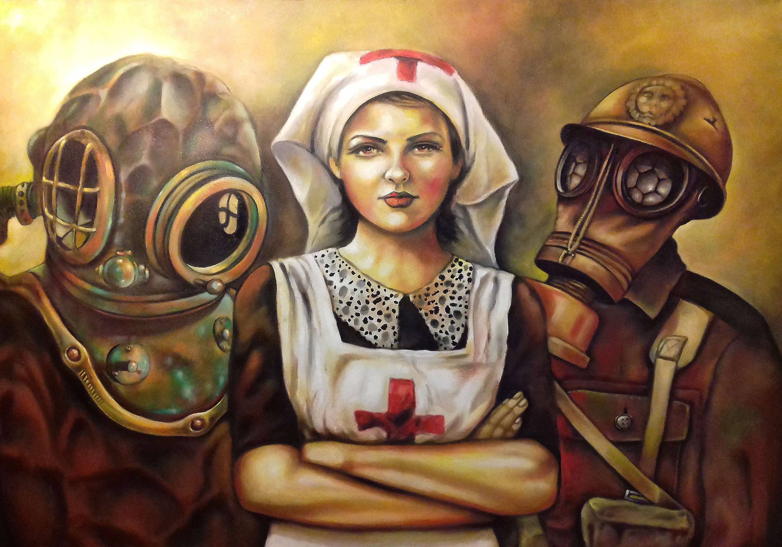 Obraz przedstawia intrygujące trio: pielęgniarka w białym fartuchu i czepku z czerwonym krzyżem oraz dwie postacie w maskach ochronnych. Kask nurka po lewej ma zielonkawe refleksy, nadając mu nieco retro look. Po prawej stoi postać w hełmie i masce gazowej o miedzianym odcieniu. Środek kompozycji wypełnia pielęgniarka z pewną siebie miną, która przyciąga wzrok swoją prostą elegancją. Tło jest ciepłe, w odcieniach żółci i brązu, co tworzy nostalgiczną, nieco tajemniczą atmosferę. Styl obrazu przypomina techniki malarskie z początku XX wieku, z wyraźnym zainteresowaniem szczegółem i fakturą. Obraz emanuje mieszanką spokoju i napięcia, jakby pokazywał chwilę w środku chaosy, gdy każdy wie, co ma robić. Można powiedzieć, że to snapshot z innego czasu. Dla dziecka była by to scena jak z filmu – "A ja bym chciał taką maskę, bo wygląda cool!" Obraz może budzić różne emocje. Z jednej strony kojarzyć się z wojennymi opowieściami o bohaterach, z drugiej strony — tajemniczość i niepokój tych masek mogą rodzić pytania o zagrożenia, z którymi mierzą się te postacie. Interpretacje są szerokie, od refleksji nad poświęceniem po zadumę nad historią. Dla mnie, osobiście, jest coś fascynującego w tej mieszance postaci — to, jak przeszłość dotyka chwili obecnej i jak artystyczny geniusz potrafi to oddać jednym pociągnięciem pędzla. Wow, amazing.
