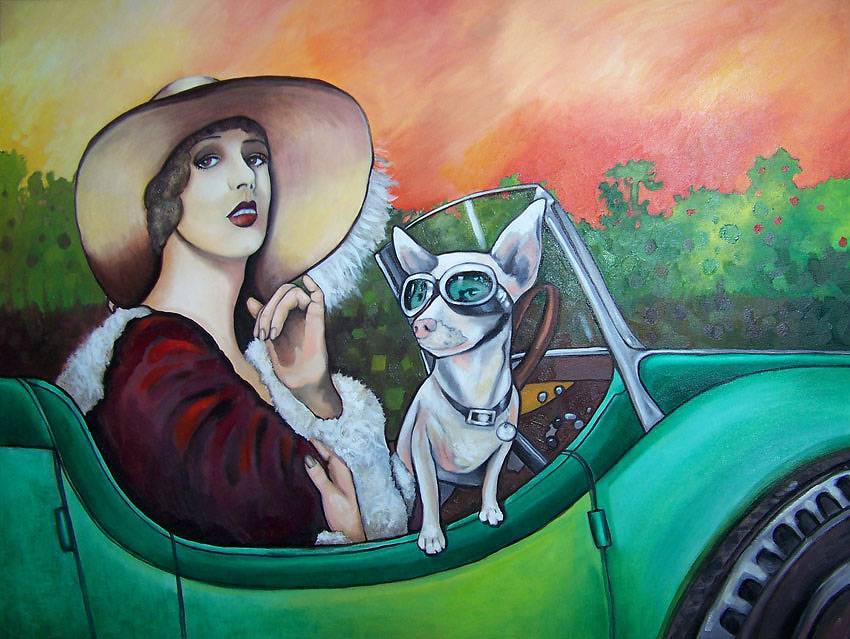 Obraz emanuje stylowym sznytem retro, zasypując widza mocnymi kolorami i detalami. Na pierwszym planie kobieta o tajemniczym wyrazie twarzy, z jasnym uśmiechem ukrytym pod kapeluszem, siedzi w starym zielonym aucie. Jej długie rękawice z futra dodają elegancji, a czerwona szminka na ustach przyciąga uwagę. Obok niej, mały, biały piesek nosi okulary, patrząc odważnie przed siebie, gotowy na przygodę. Tło to przebarwione niebo o barwach zachodzącego słońca, mieszające żółcie i pomarańcze z zielenią drzew. Atmosfera obrazu zdaje się być pełna nostalgii i marzeń o minionych czasach. Styl artystyczny przypomina prace z lat 20., uwydatniając wyraziste linie, kolorowe kontrasty i swego rodzaju surrealizm. Ten obraz jest totalnie super. Technika game-changer: mieszanka realizmu z odrobiną komiksowego podejścia sprawia, że wszystko wydaje się dynamiczne i pełne życia. Widz może poczuć swobodną, radosną atmosferę jazdy bez celu, przepełnioną wolnością i beztroską. Osobiście, patrząc na ten obraz, wywołuje on u mnie chęć na spontaniczną wycieczkę. Czuję się jakbym mógł od razu usiąść za kierownicą tego auta i po prostu jechać przed siebie, nie martwiąc się o jutro. W pewien sposób, sztuka ta może podkreślać pragnienie wolności, dążenie do nieznanego, a przy tym po prostu czerpanie radości z każdej chwili.