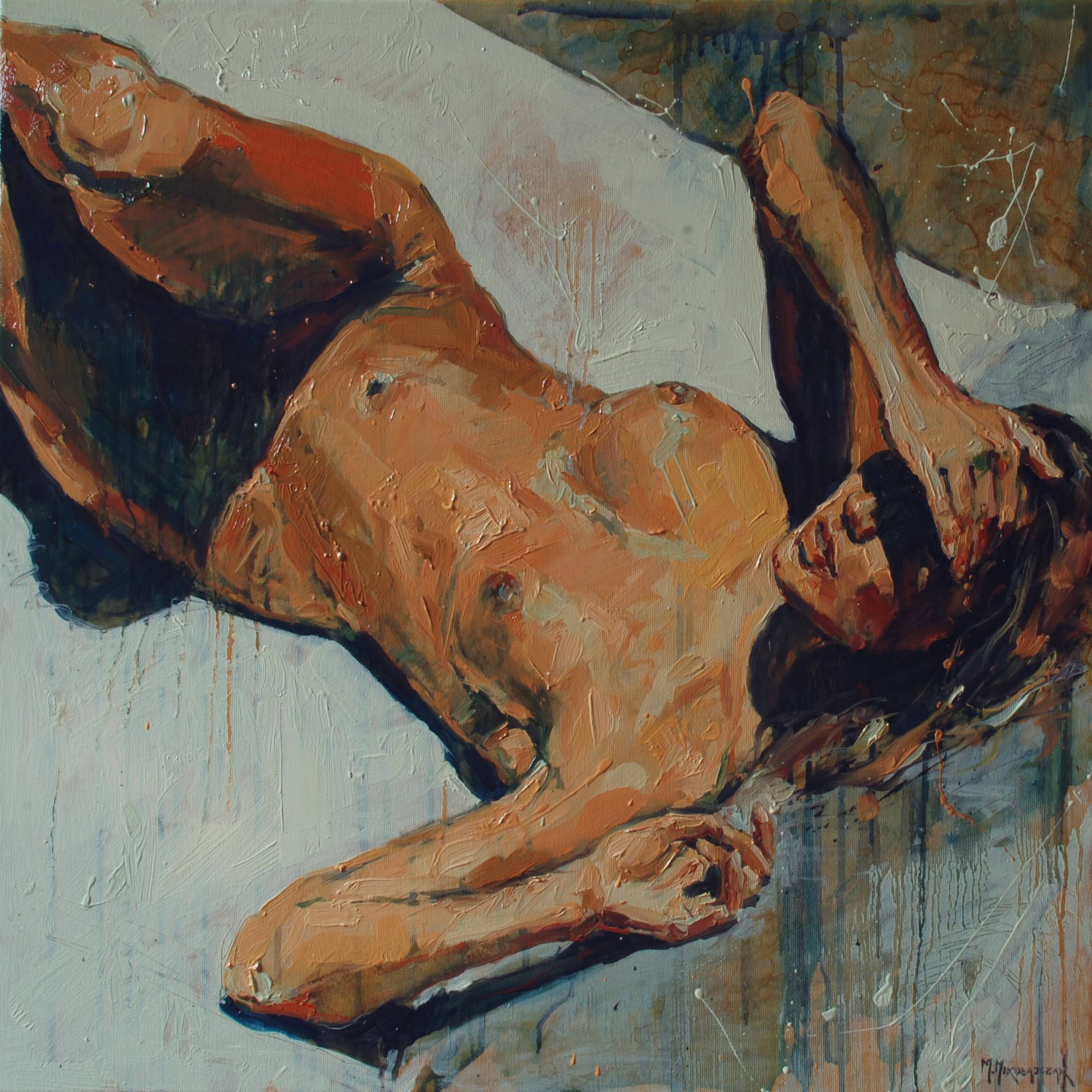 Obraz przestawia nagą postać leżącą na jasnym tle, gdzie dominują ciepłe odcienie brązu i beżu, przeplatane dynamicznymi cieniami. Faktura farby jest gruba, pełna impastu, tworzącego efekt trójwymiarowości. Kompozycja wydaje się zarówno swobodna, jak i przemyślana, z liniami kierującymi wzrok wzdłuż sylwetki. Na pierwszy rzut oka, obraz emanuje spokojem, ale też tajemnicą. Nastrój jest nieco kontemplacyjny, niemal intymny. Technika malarska wskazuje na śmiałość artysty, który za pomocą ekspresyjnych pociągnięć pędzlem oddaje gry światła i cienia. Taka śmiałość dodaje dziełu energii i emocji. Wow! Interpretując, widz może odczuwać pewną relaksację, ale też zagadkę — kim jest osoba na obrazie, o czym myśli? To pytania, które mogą pozostać bez odpowiedzi. A może ten obraz to po prostu manifestacja piękna ludzkiego ciała? Dla kogoś innego będzie to exploration uczuć intymnych. Ten afirmatywny temat jest wyczuwalny jako celebration życia i ciała. Jest w tym coś, co przyciąga. Osobiście czuję, że obraz mówi o kruchości i sile jednocześnie. Mała dziewczynka krzyknęłaby: "Mama, ta pani jest zmęczona!". Całość pozostawia wrażenie spokoju po burzy, gdzie artystyczna swoboda łączy się z wyjątkowym uchwyceniem chwili.