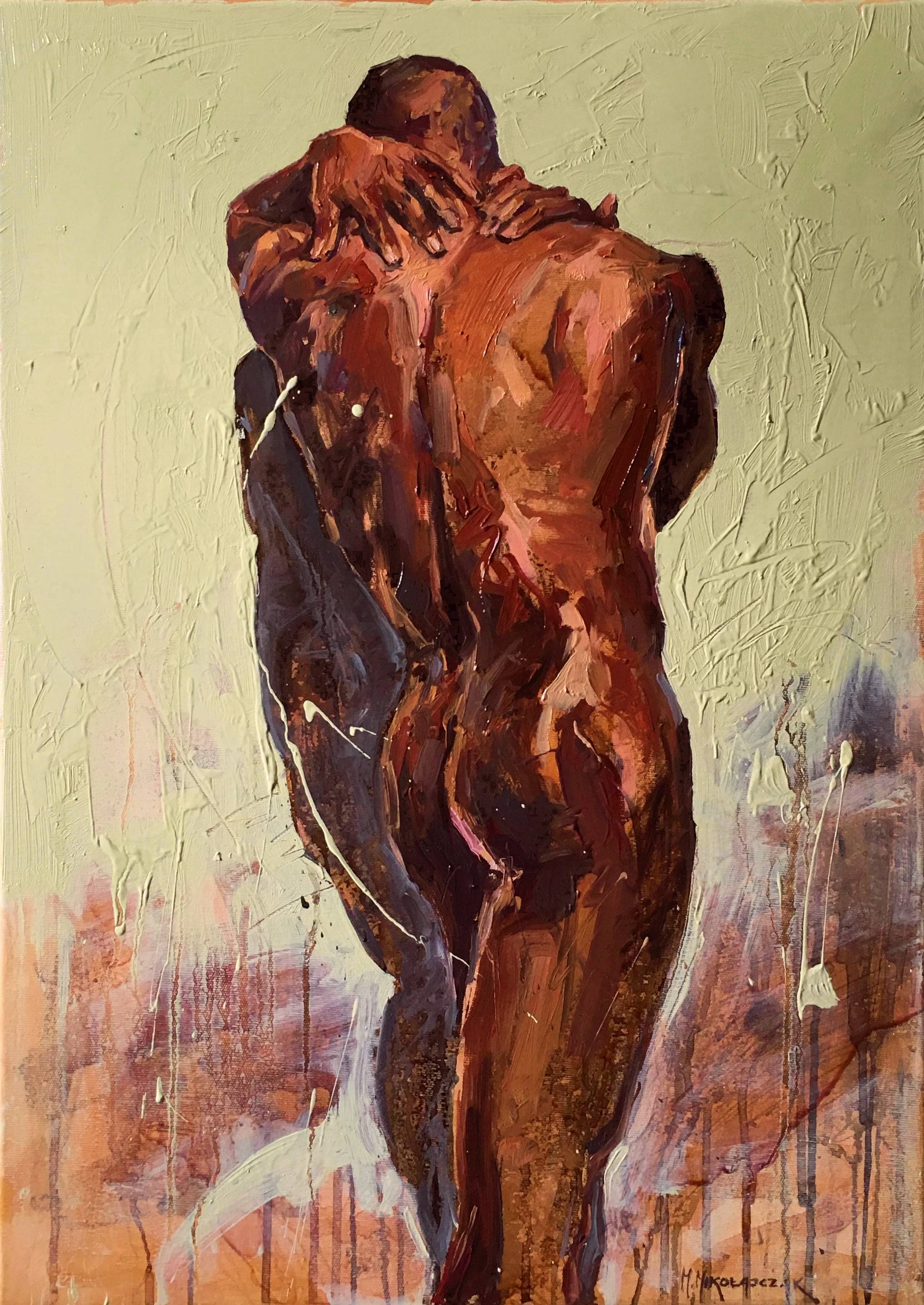 Obraz przyciąga uwagę wyrazistą paletą kolorów, gdzie dominują ciepłe brązy i subtelne, ziemiste tony, kontrastujące z chłodnym, pistacjowym tłem. Postać ludzka, centralny element kompozycji, ukazana jest z tylu w dynamicznej pozie, która sprawia wrażenie utknięcia w chwili zadumy lub refleksji. Kiedy na niego patrzę, czuję jakby artysta uchwycił moment zamyślenia, niemal jakby postać chciała wyrwać się z płótna. Styl jest ekspresyjny, malowanie za pomocą grubych impast oddaje fakturę ciała, co dodaje obrazowi fizyczności i głębi. Stosując naturalistyczną technikę, artysta przekazuje autentyczność emocji, ale jednocześnie zostawia przestrzeń na osobistą interpretację. Co chwila przychodzi mi na myśl słowo 'raw', podkreślające surowość i intensywność wyrazu. Obraz może budzić w odbiorcy poczucie samotności, ale także intymności. Wydaje się mówić: "Zatrzymaj się na chwilę". Wywołuje to we mnie refleksję o ulotności momentów i emocji. Może to też opowieść o wolności, tworząc przestrzeń, gdzie odbiorca może odkrywać własne uczucia. A co, jeśli ta postać marzy o wakacjach? Tak by powiedziało dziecko, prostota i czystość dziecięcych myśli oddaje tu cały urok i tajemniczość pracy.