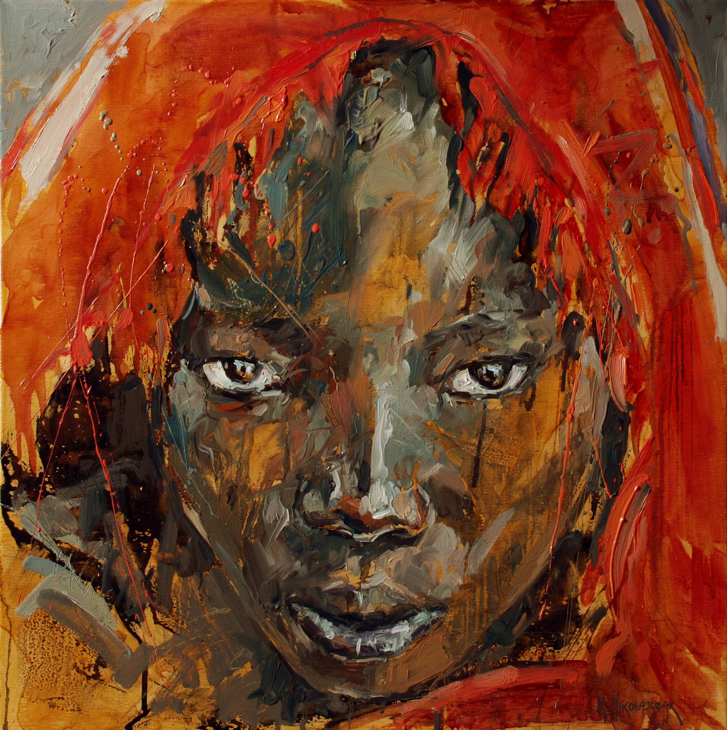 Obraz emanuje niezwykłym pięknem i siłą. Oczy patrzą na odbiorcę z głębią, podczas gdy intensywne odcienie pomarańczy i czerwieni dominują nad całą kompozycją. Kolory te niczym płomienie otaczają twarz, nadając jej wyrazistości i tajemniczości. Artysta zastosował technikę impastu, gdzie grube warstwy farby tworzą trójwymiarową teksturę. Kształty utrzymane są w nieco abstrakcyjnej formie, co dodaje dynamiki i sprawia, że obraz niemalże pulsuje życiem. To dzieło emanuje energią i surowością. Atmosfera jest napięta, niemal magnetyczna, przyciągająca wzrok każdego, kto na nie spojrzy. Wiesz, jak mały kotek mruga? Tak właśnie patrzą te oczy. Styl obrazu przywołuje na myśl ekspresjonizm – uczucia malowane na płótnie w sposób niemal brutalny, szczery do bólu. Patrząc na tę twarz, trudno nie odczuwać mieszanki fascynacji i niepokoju. Emocje zmieniają się jak w kalejdoskopie, a wyobraźnia zaczyna wędrować po zakamarkach duszy, szukając odpowiedzi na niewypowiedziane pytania. Wow! To może być deklaracja wewnętrznej walki lub afirmacja siły. Jedno jest pewne – ten obraz nie pozostawia nikogo obojętnym.