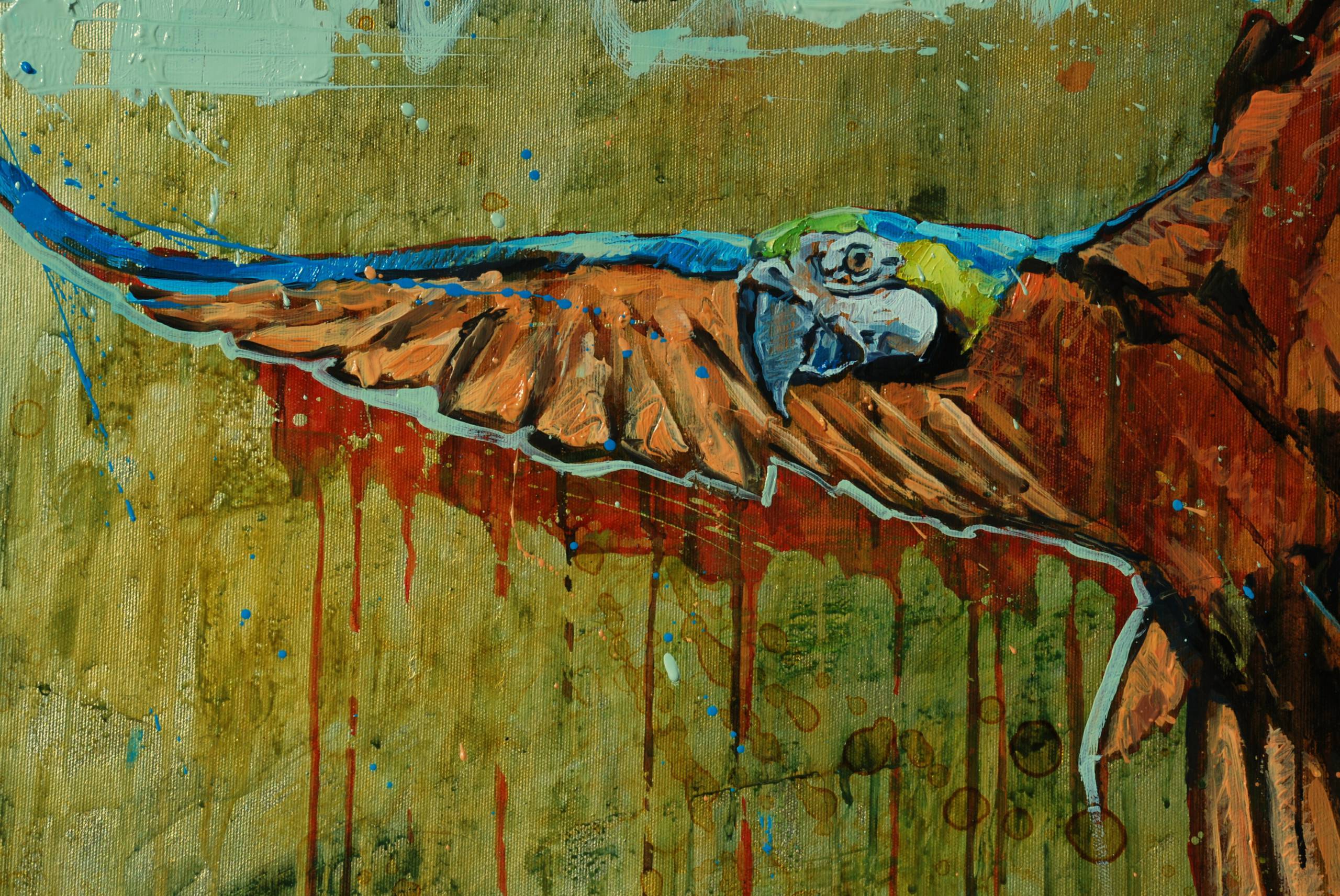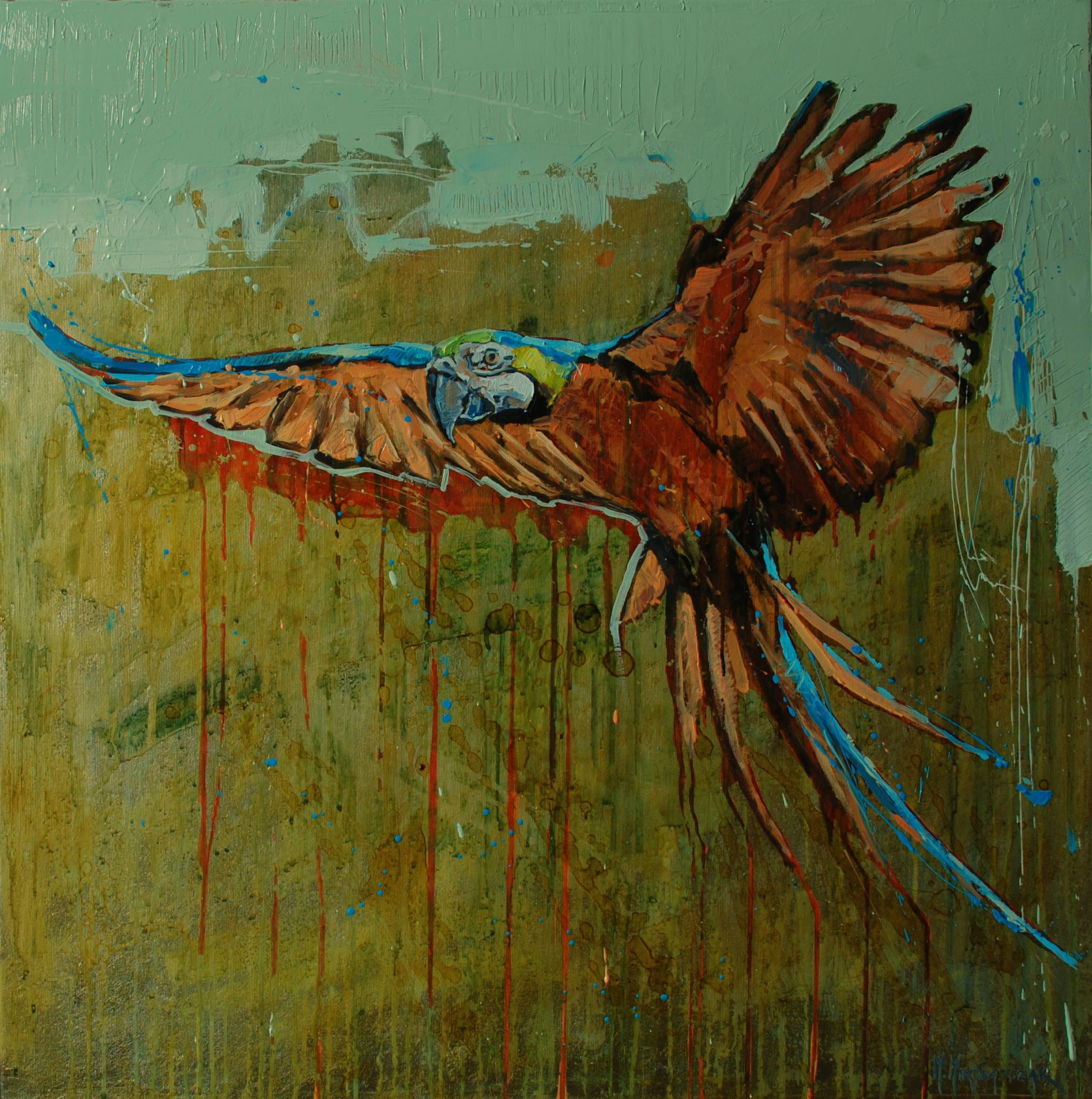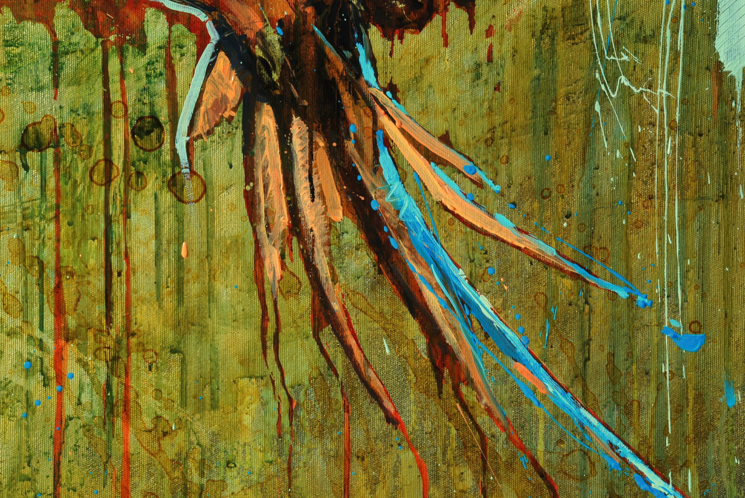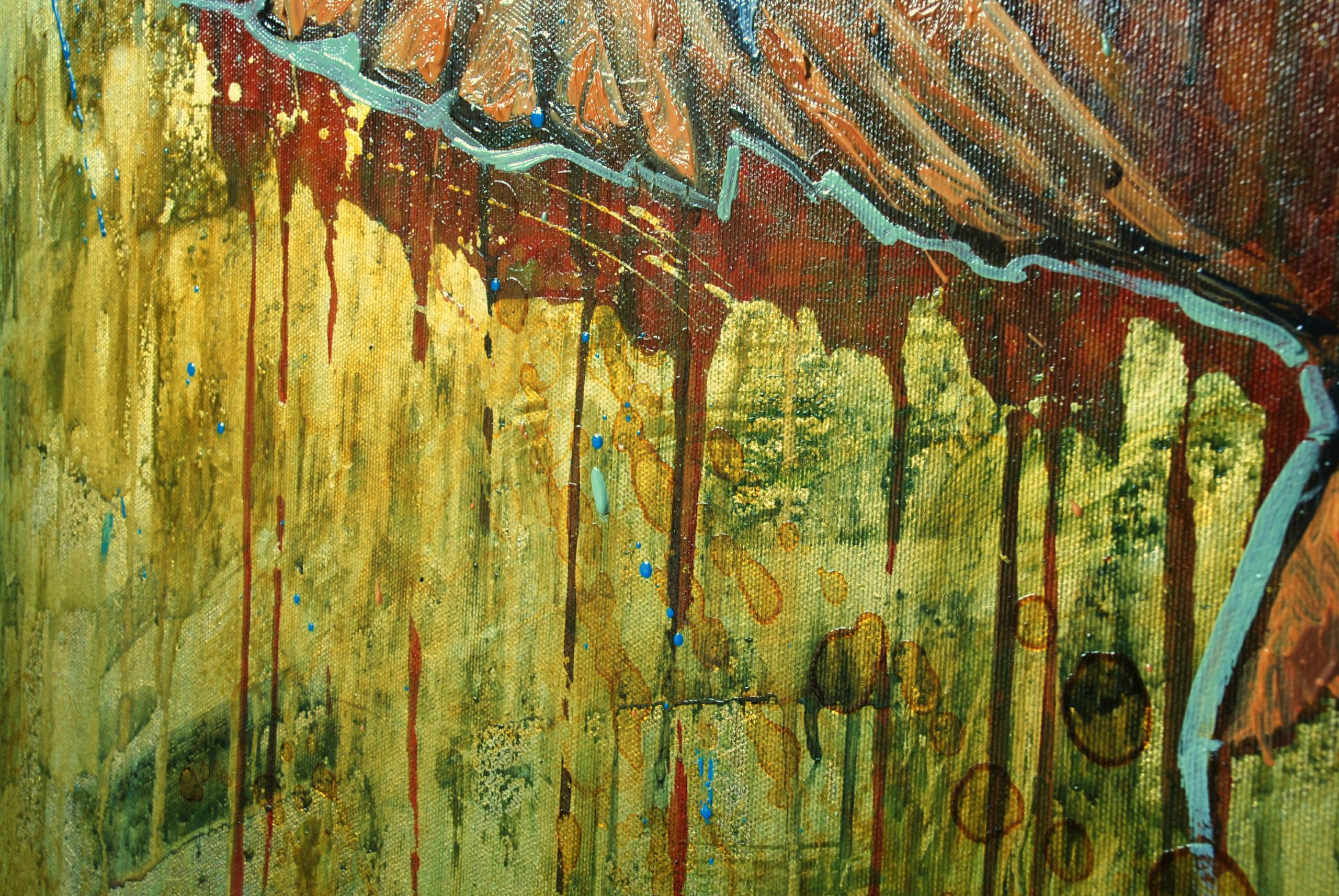 Technika własna + farba olejna. Zielone tło ma podkład z płatków szlagaluminium, Błyszczy się pod odpowiednim kontem. Boki pracy zamalowane, nie wymaga oprawy. Data 2016