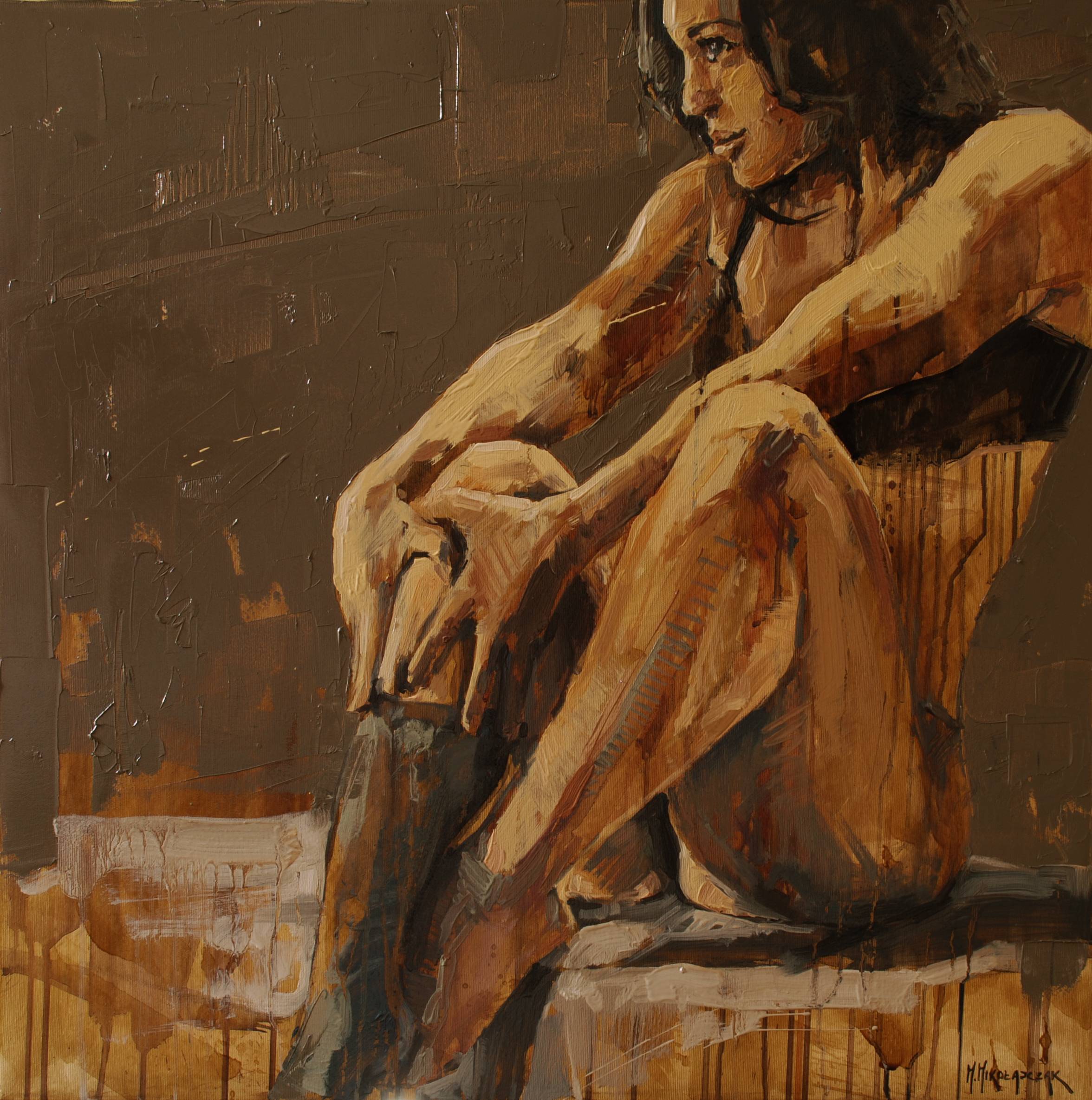 Obraz emanuje ciepłem i intymnością. Główne kolory to brązy i beże, które tworzą harmonijną i spokojną kompozycję. Postać na pierwszym planie jest ułożona w zamyślonej pozie. Artysta zastosował technikę impasto, nadającą powierzchni pewnej struktury i głębi. Kształty są niedopowiedziane, co wzbudza ciekawość. Atmosfera emanuje intymnym spokojem, ale jest też trochę melancholii. Można poczuć, jakby obraz kogoś objął. Kojarzy się to z chwilami, kiedy siedzisz i myślisz o całym świecie. Jest tu coś w rodzaju "cozy feeling". Mała dziewczynka powiedziałaby: ta pani wygląda, jakby marzyła o cukierkach. Artystyczne niedoskonałości dodają dynamiki, przypominając, że piękno tkwi w niedoskonałościach. Intrygujący styl sprawia, że można patrzeć i patrzeć, szukać ukrytych historii i wspomnień. Gdzieś na dnie serca czuć ciepło, jakby ten obraz był ciepłym kocem w chłodny dzień. Zachwyca i uspokaja, jednocześnie prowokując do refleksji.