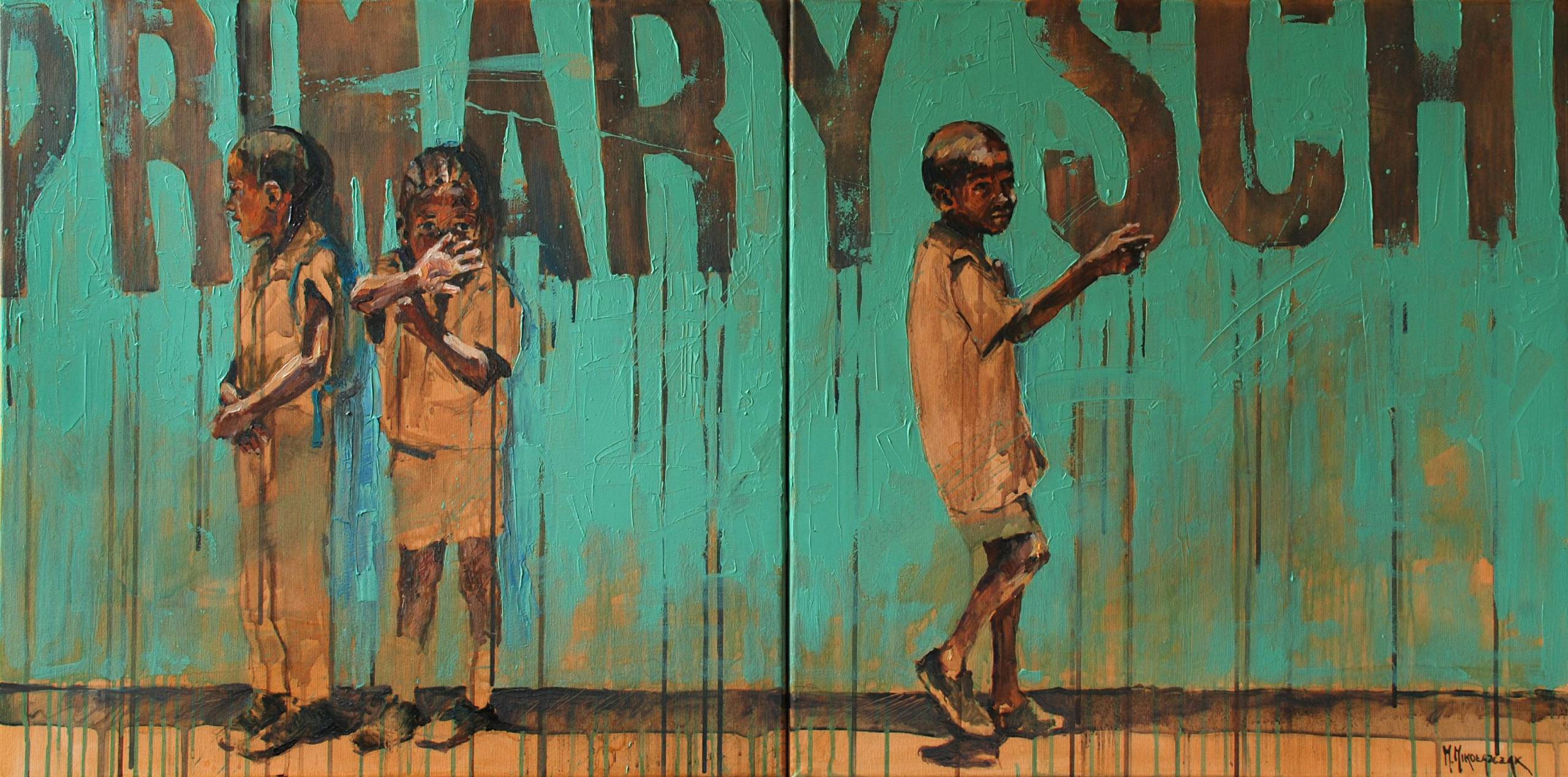 Obraz przedstawia troje dzieci na tle turkusowej ściany z dużymi literami, które tworzą napis. Dominują tu kolory ziemiste, brązy i beże, które kontrastują z wyrazistym tłem. Artysta zastosował technikę impasto, co nadaje powierzchni fakturę, a farba zdaje się delikatnie spływać. Układ postaci — odwrócone plecami, niektóre z zamkniętymi gestami — tworzy atmosferę zagubienia i refleksji. Dzieci wyglądają jakby były rozerwane między światem szkoły, a swoimi własnymi myślami. Styl dzieła jest surowy, nieco minimalistyczny, co pogłębia wrażenie pustki i niepokoju. Patrząc na postaci, przechodzimy przez całą gamę emocji — od ciekawości przez zadumę do lekkiego smutku. To tak jakby artysta chciał powiedzieć, "czy wszystko jest takie jasne, jak by się zdawało?" Dziecięca niewinność kontra surowość otoczenia sprawiają, że przypomina się beztroska z czasów podstawówki, ale z nutą "uncertainty". Kiedy patrzę na to dzieło, zastanawiam się, jakie historie te dzieci noszą w sercach. Może jest w tym coś z nostalgii za utraconym dzieciństwem, chociaż dzieci pewnie po prostu się bawią. Ten obraz jest jak stary album ze zdjęciami, który przeglądasz w deszczowe dni.