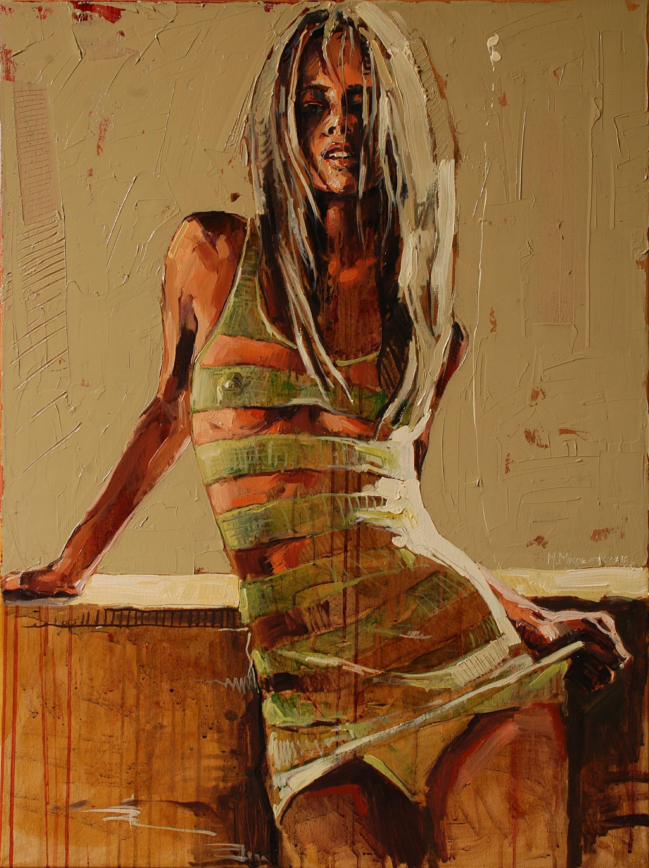 Na obrazie widzimy kobietę o długich, jasnych włosach, odzianą w sukienkę w zielono-żółte paski. Jej postawa jest pewna siebie, jakby mówiła: "tu jestem, patrz na mnie". Tło jest minimalistyczne, w ciepłych odcieniach beżu, które podkreślają sylwetkę głównej postaci. Kolory są wyraziste, ale stonowane, co nadaje całości bardzo intymny klimat. Pędzel artysty zdaje się tańczyć po płótnie, nadając dziełu dynamizmu. Widać tu technikę impasto, dzięki której faktura jest wyraźna i "zgrubna". Dzieło emanuje atmosferą swobodą i letnią beztroskością, taką jak wtedy, gdy słońce grzeje, a letnie dni zdają się trwać wiecznie. Możesz niemal poczuć jej energię i siłę. Dzieciak by powiedział: "Ona wygląda jak superbohaterka". Takie odczucia, pełne dziecięcej energii, również odnaleźć można w tej kompozycji. Obraz może budzić w widzu różne emocje. Może to być zachwyt nad dynamiką i wyrazistością postaci. Albo subtelny niepokój związany z tajemniczością jej spojrzenia. A jaki nastrój w Tobie wywołuje ten kawałek "art"? Prawdziwa uczta dla oczu. Szalona mieszanka emocji, jakby artysta chciał oddać pełnię życia w jednej chwili.