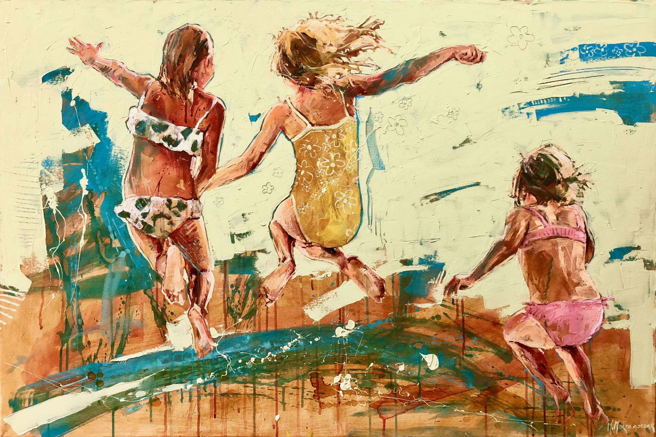 Obraz przedstawia trzy rozbrykane postaci, dzieci skaczące radośnie w letnich strojach kąpielowych. Kolory są żywe i nasycone, dominują ciepłe brązy i żółcie, a także chłodne błękity. W tle subtelne, rozmazane pociągnięcia pędzla dodają ruchu i lekkości, żar letniego dnia niemal czuć w powietrzu. Kompozycja jest dynamiczna, wciąga wzrok i prowadzi go za skaczącymi dziećmi. Czy to nie jest freedom? Mamy wrażenie oglądania sceny pełnej beztroskiej zabawy i spontaniczności. Styl artysty widać w luźnych, niemal impresjonistycznych technikach, gdzie szczegóły ustępują miejsca emocjom. Obraz niemalże się rusza, każda linia wydaje się tańczyć. Pastelowe, ale pełne mocy barwy, nasycają przestrzeń między postaciami, a każda kropla farby zdaje się opowiadać historię szczęścia i wolności. To jakby patrzeć na świat oczami dziecka, gdzie wszystko jest prostsze. "Chcę tam być!" – powiedziałoby dziecko. Atmosfera obrazu jest przepełniona radością, niewinnością i ciepłem letniego dnia. Oglądając to dzieło, dorosły może poczuć nutkę nostalgii za czasami, które dawno minęły. Artysta genialnie uchwycił chwilę, która mogłaby być wspomnieniem z wakacji. Dla mnie, to prawdziwy kawałek słońca na płótnie, eteryczny i ulotny.