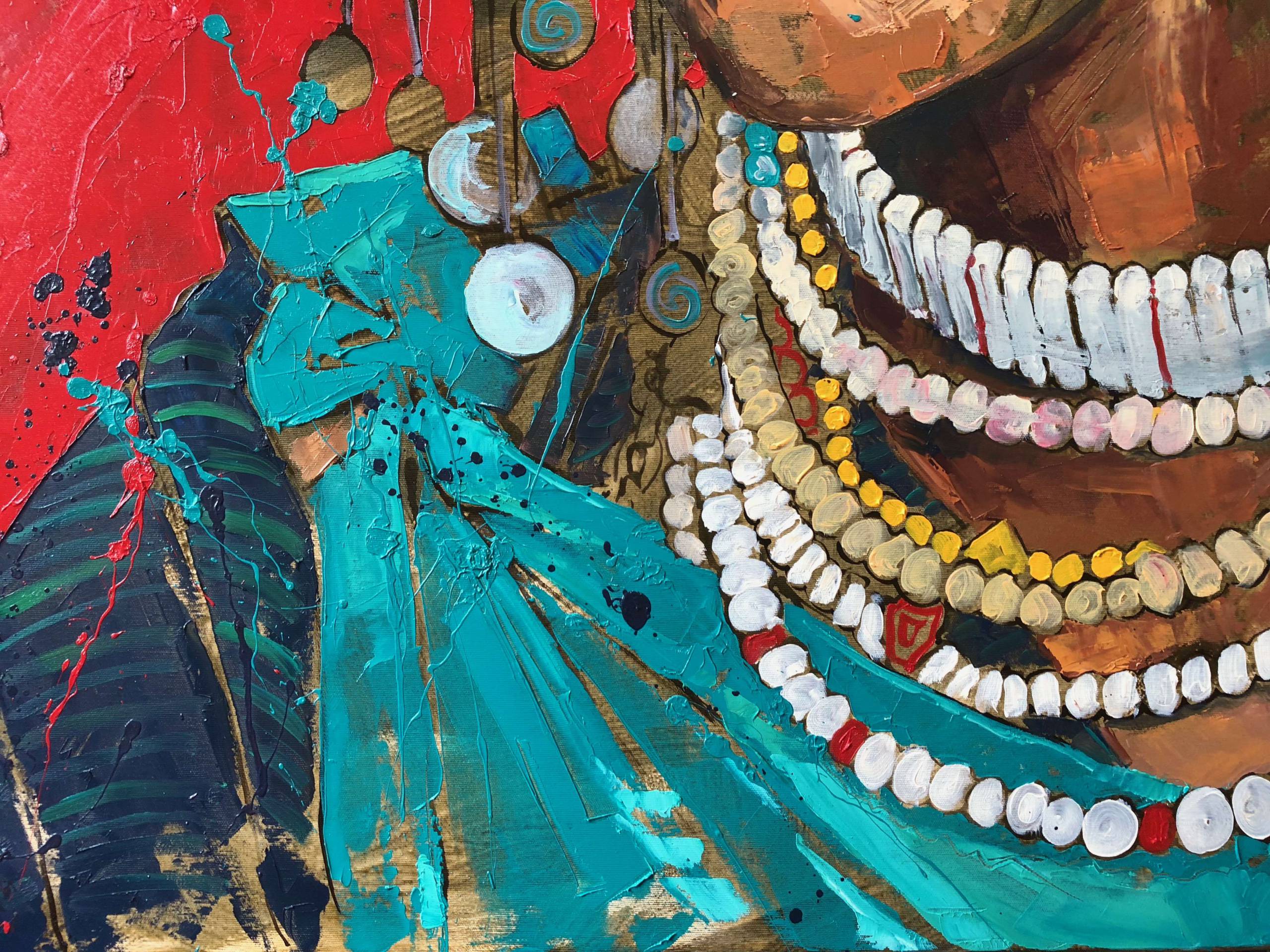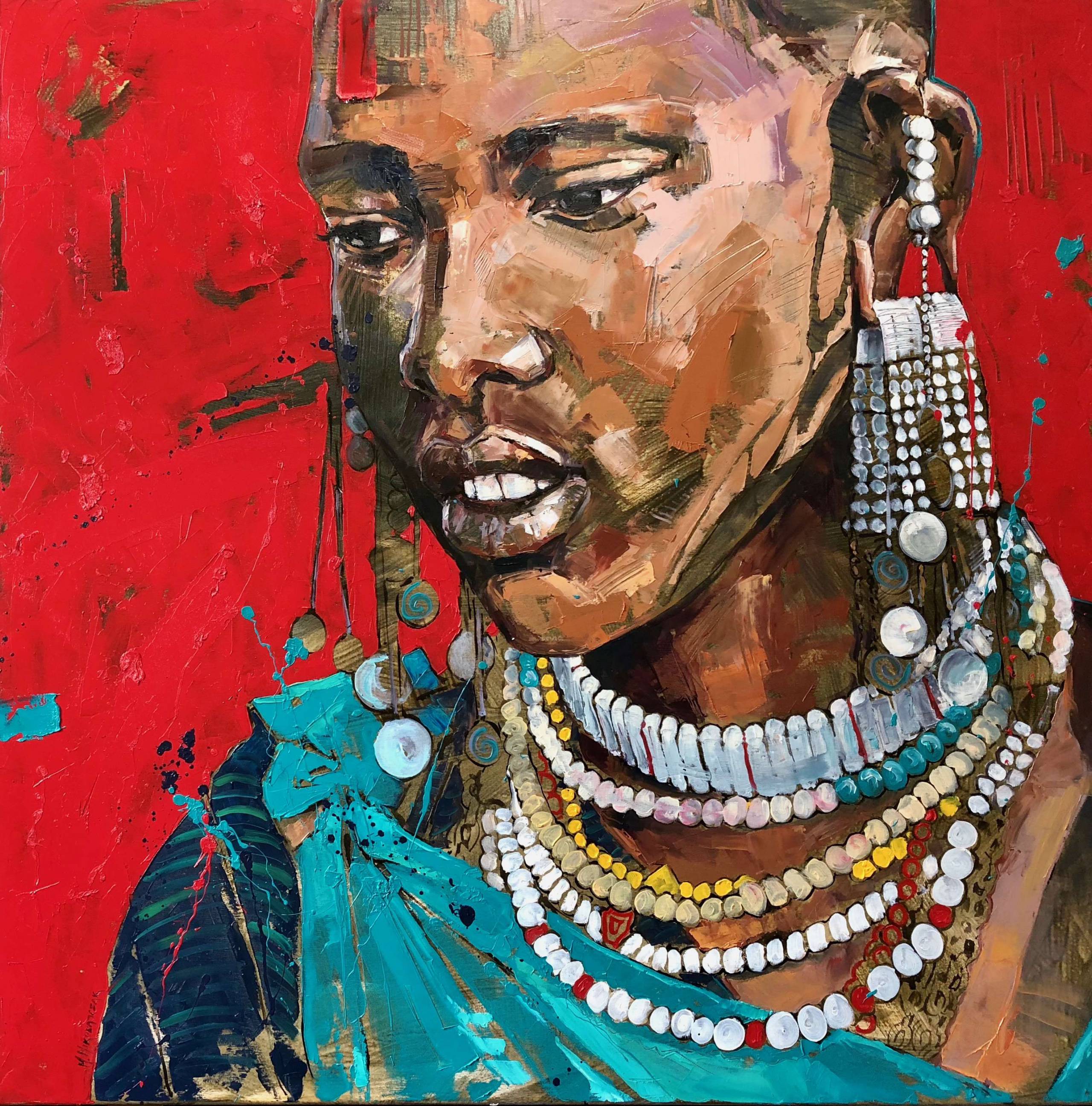Na tym obrazie dominują intensywne kolory. Widzimy tło w gorącym odcieniu czerwieni, kontrastującym z bogatym brązem twarzy. Centralna postać emanuje siłą i spokojem, a jej oczy zdają się przenikać przez płótno. Naszyjniki i kolczyki zdają się niemal wychodzić z obrazu. Artysta zastosował technikę impasto, dzięki której faktura farby tworzy wrażenie trójwymiarowości. Jest taka jedna myśl, że ta pani wygląda jak królowa. Atmosfera jest niezwykle hipnotyzująca. Można się poczuć tak, jakby za chwilę ta osoba miała ruszyć i przemówić. To bardzo dynamiczne połączenie żywych kolorów z ekspresyjnym ruchem pędzla. Styl artysty przywodzi na myśl współczesne interpretacje tradycyjnych portretów, łącząc obrazy kultury z nowoczesnymi elementami. To dzieło może wywoływać różne emocje. Od refleksji nad bogactwem kulturowym po czystą fascynację pięknem detalu. Czy jej spojrzenie jest pełne nadziei, czy zamyślenia? Dla mnie obraz w pewien sposób przypomina „power” kobiecości i siły. Uwielbiam, jak każdy element współgra, tworząc harmonijną całość. I love it!