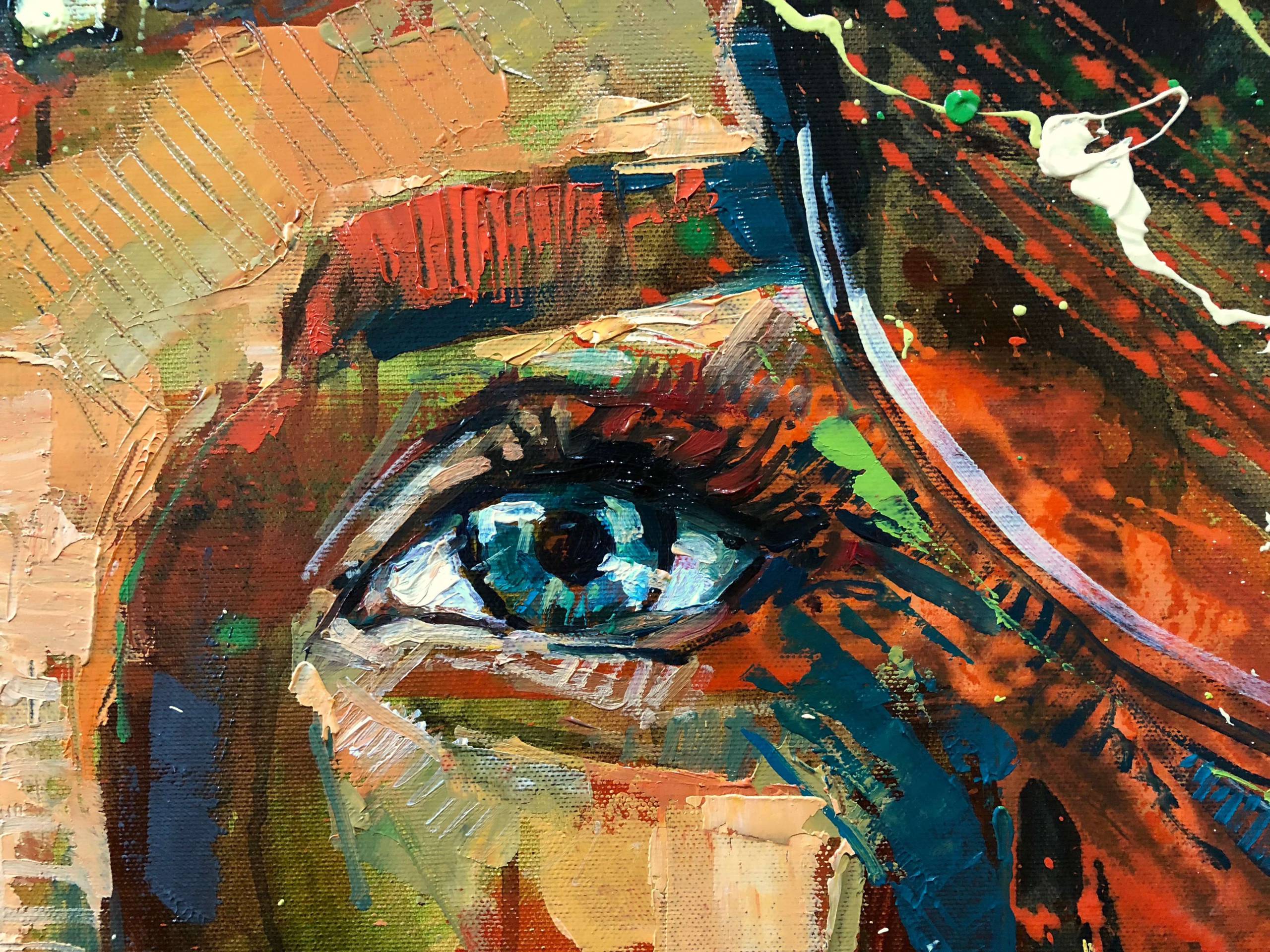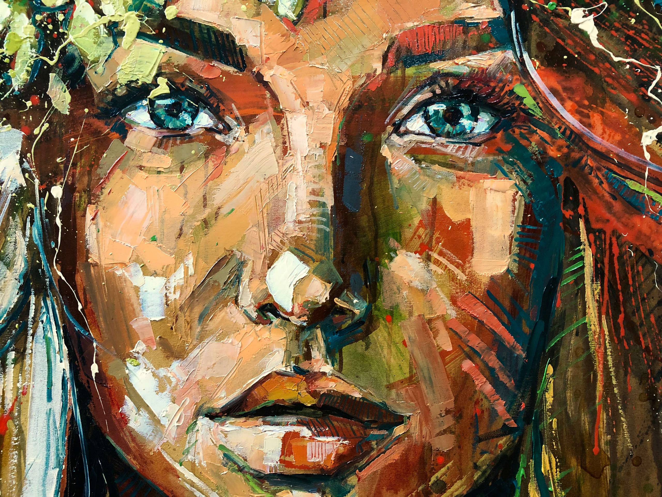 Obraz przedstawia piękną twarz kobiety otoczoną zielonymi liśćmi, które wydają się tańczyć wokół jej głowy, jakby były częścią jakiegoś magicznego lasu. Kolory są ciepłe i żywe: dominuje zieleń, brąz i odcienie kremowego beżu, które współgrają z rudymi akcentami włosów, tworząc kalejdoskop emocji. To coś jak „wow” moment, gdy patrzysz na te intensywne błękitne oczy, przyciągające wzrok jak magnes. Artysta zastosował ekspresyjne pociągnięcia pędzla, gdzie farba wręcz eksploduje na płótnie, tworząc dynamiczny i pełen energii efekt. Techniki impasto przydają portretowi niemal trójwymiarowej faktury, co sprawia że obraz wręcz „żyje” przed oczami. To jakby ktoś wrzucił całą paletę emocji na jedną powierzchnię i zamknął je w ramy. Gdy na to patrzę, czuję jakąś niewypowiedzianą tęsknotę za naturą i jej nieokiełznanym pięknem. Huh, no to jest jak spotkanie z dziką stroną świata. Dla dziecka obraz pewnie będzie jak zaczarowana księżniczka z lasu, co jest bardzo exciting. Każdy kąt twarzy zdaje się szeptać inne historie, tajemnicze i pełne nadziei. Emocje płynące z tego obrazu mogą wzbudzać ciepłe, refleksyjne myśli, dając poczucie wolności i jedności z naturą. Coś niezwykle fascynującego i wciągającego, po prostu magic.