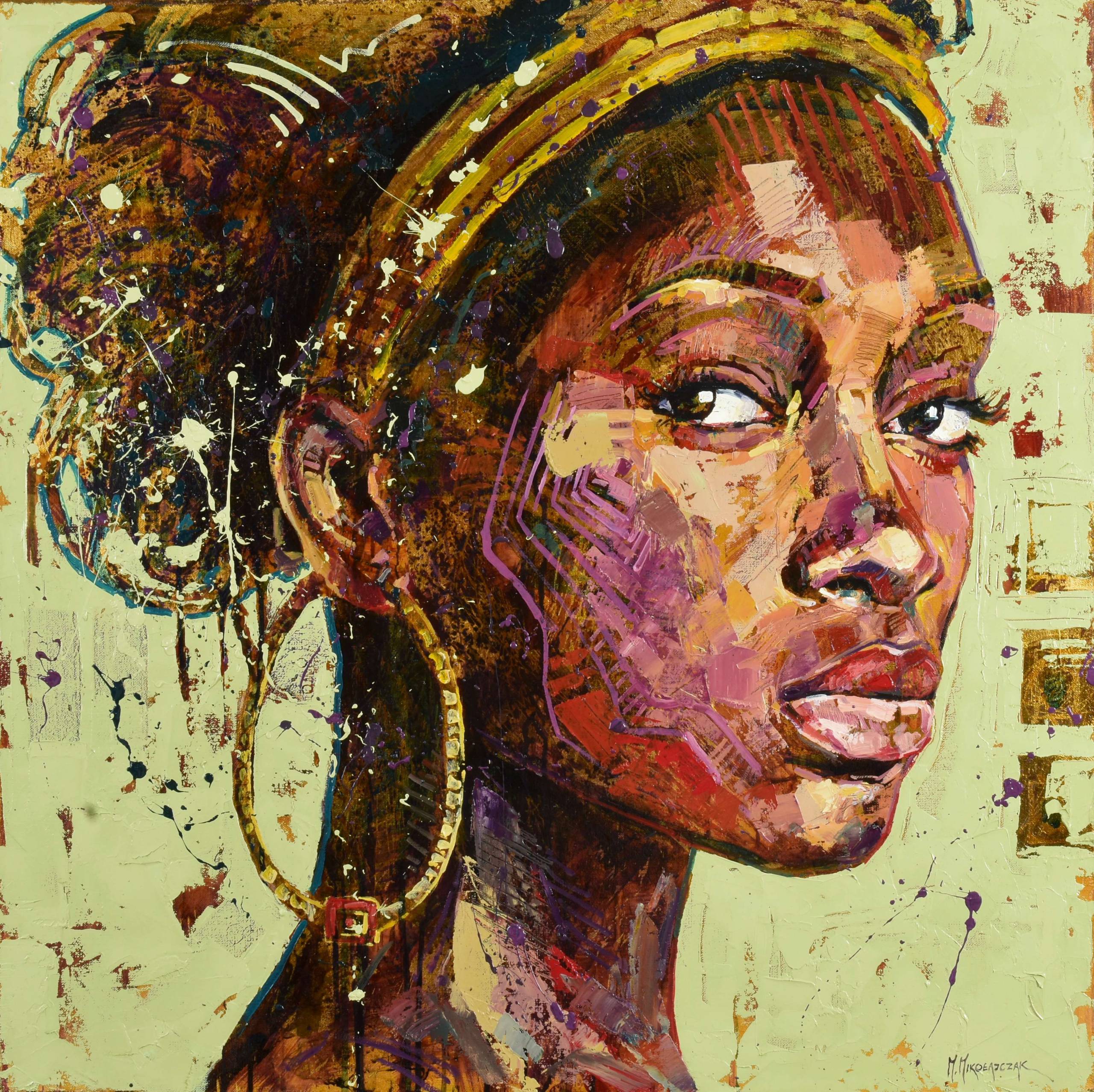 Obraz namalowany techniką własną połączoną z farbą olejną i płatkami oksydowanego szlagmetalu. Praca została namalowana na wysokiej jakości płótnie lnianym. Boki są zamalowane, nie wymaga oprawy.
