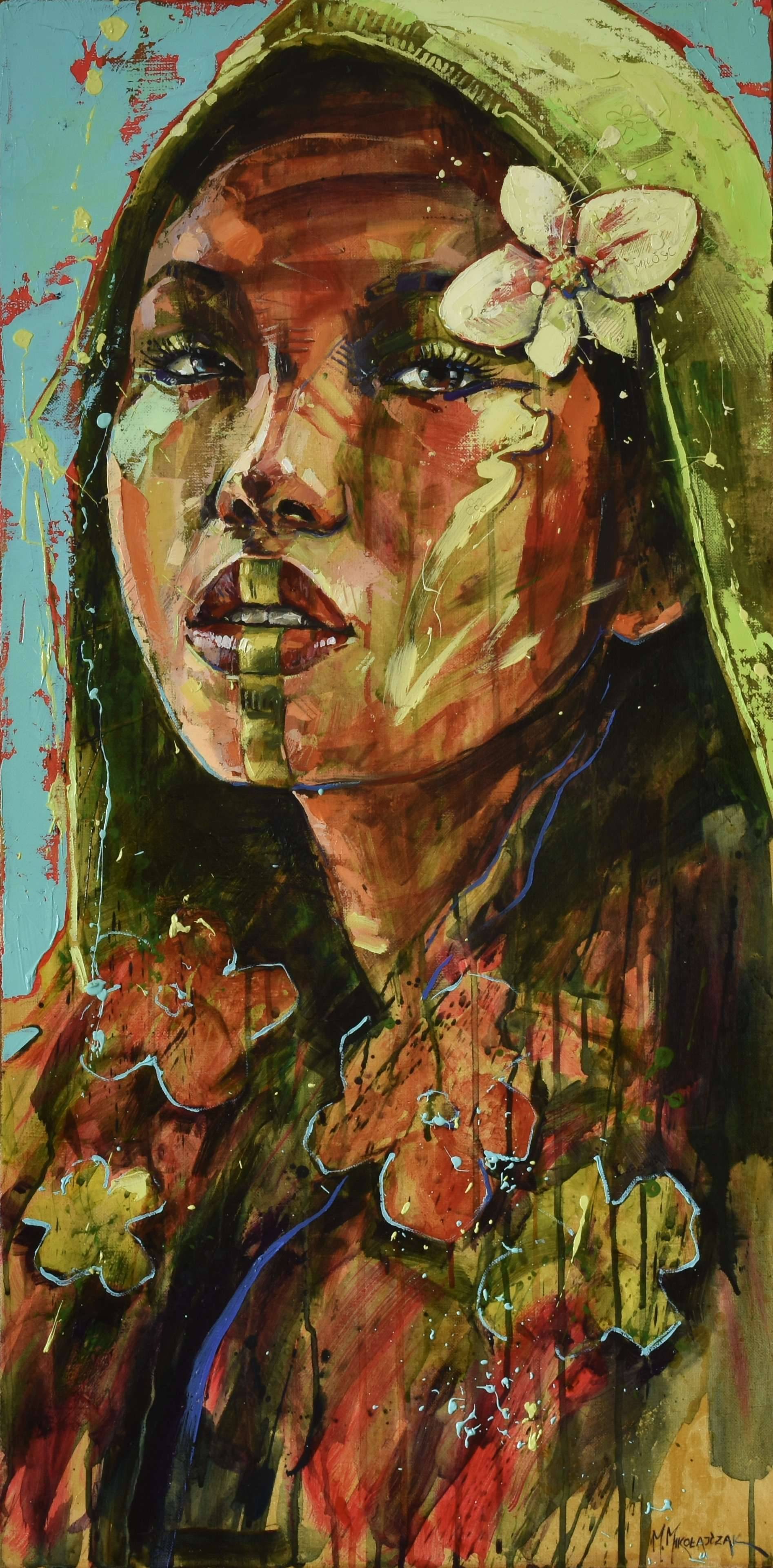 Technika własna połączona z farbą olejną. Boki obrazu są starannie wykończone, nie wymaga oprawy. Obraz malowany na płótnie lnianym.