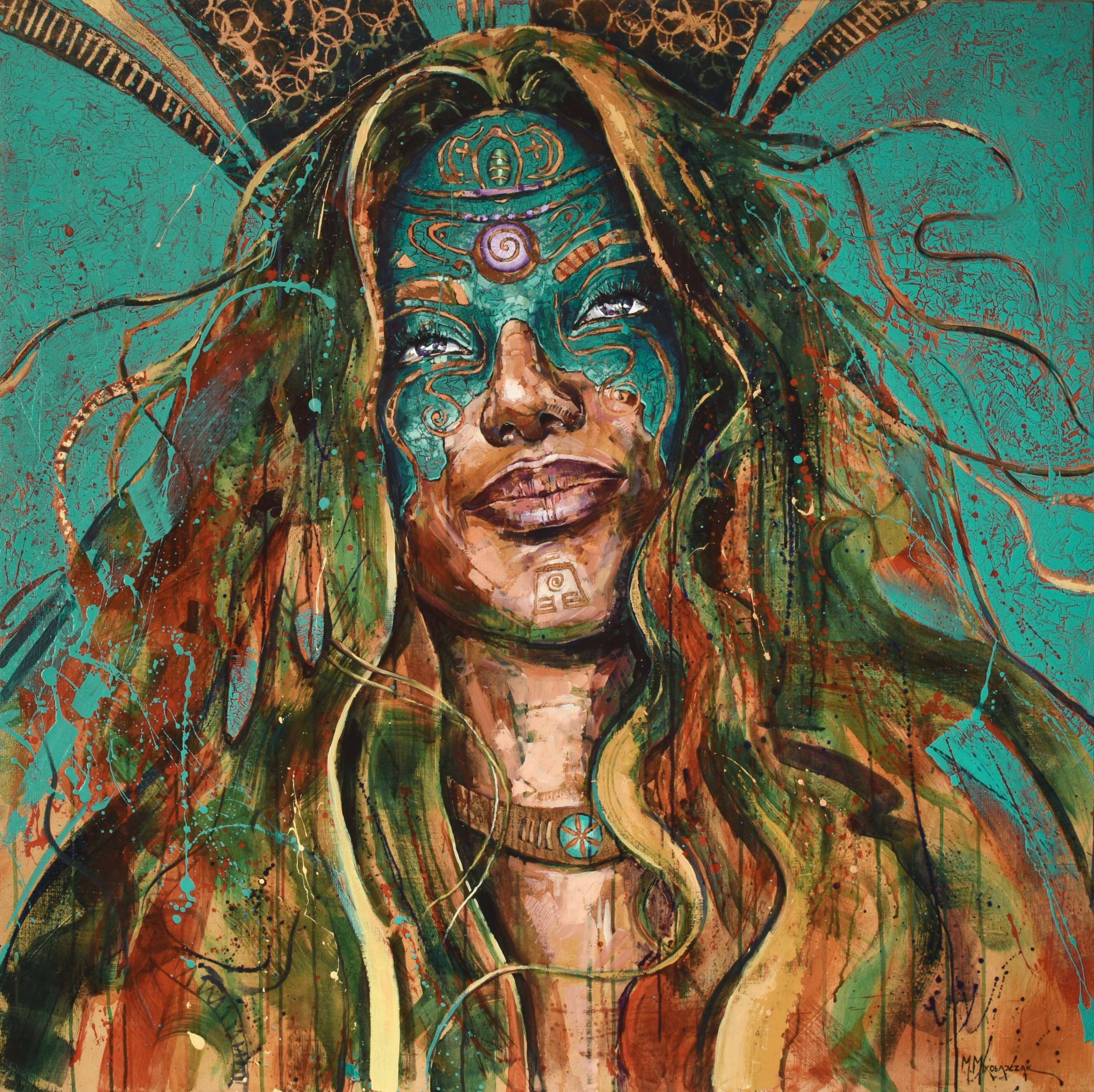 "Strażniczka sekretów" Format: 120x120x4 cm Technika własna połączona ze szlagmetalem (złotem) i farbą olejną. Obraz posiada starannie wykończone boki, nie wymaga oprawy.