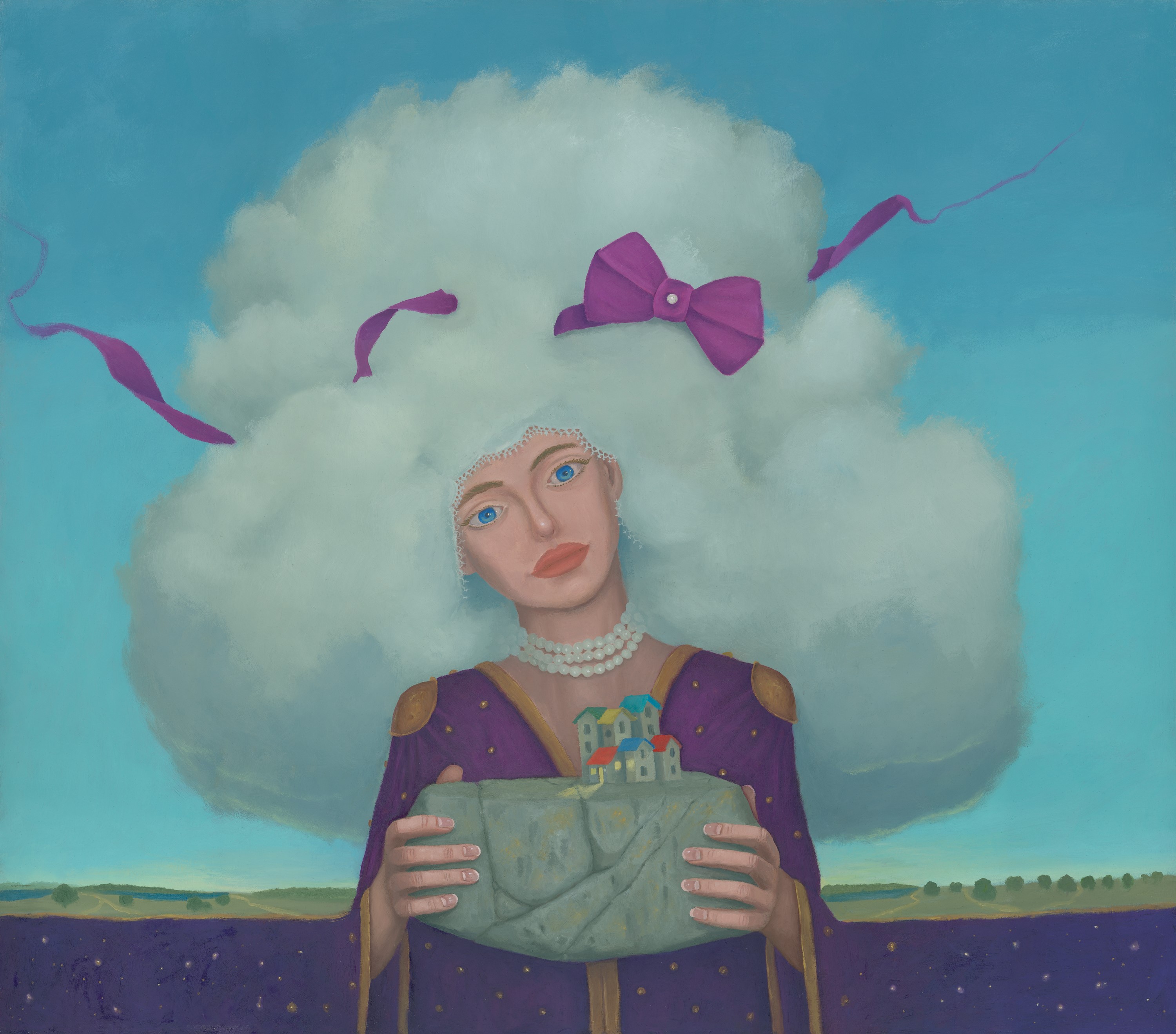 Na obrazie widać kobietę o porcelanowej twarzy i ogromnych, obłokowatych włosach, które rozlewają się niemal na całe niebo. Błękitne tło jest czyste, spokojne, a fioletowe kokardy i wstążki dodają mu lekkiego, trochę baśniowego pazura. Postać trzyma w dłoniach kamienny blok z miniaturowymi domkami, jakby nosiła czyjś mały świat. Kompozycja jest centralna, symetryczna, ale nie sztywna. Styl balansuje między realizmem a snem, z gładkim modelunkiem i delikatnym światłem. Jest tu cisza, melancholia i coś dziwnie czułego. Ja serio czuje, jakby ten obraz mówił o trosce, kruchości i dźwiganiu cudzych historii. Trochę nieoczywisty, trochę piękny, po prostu zostaje w głowie.