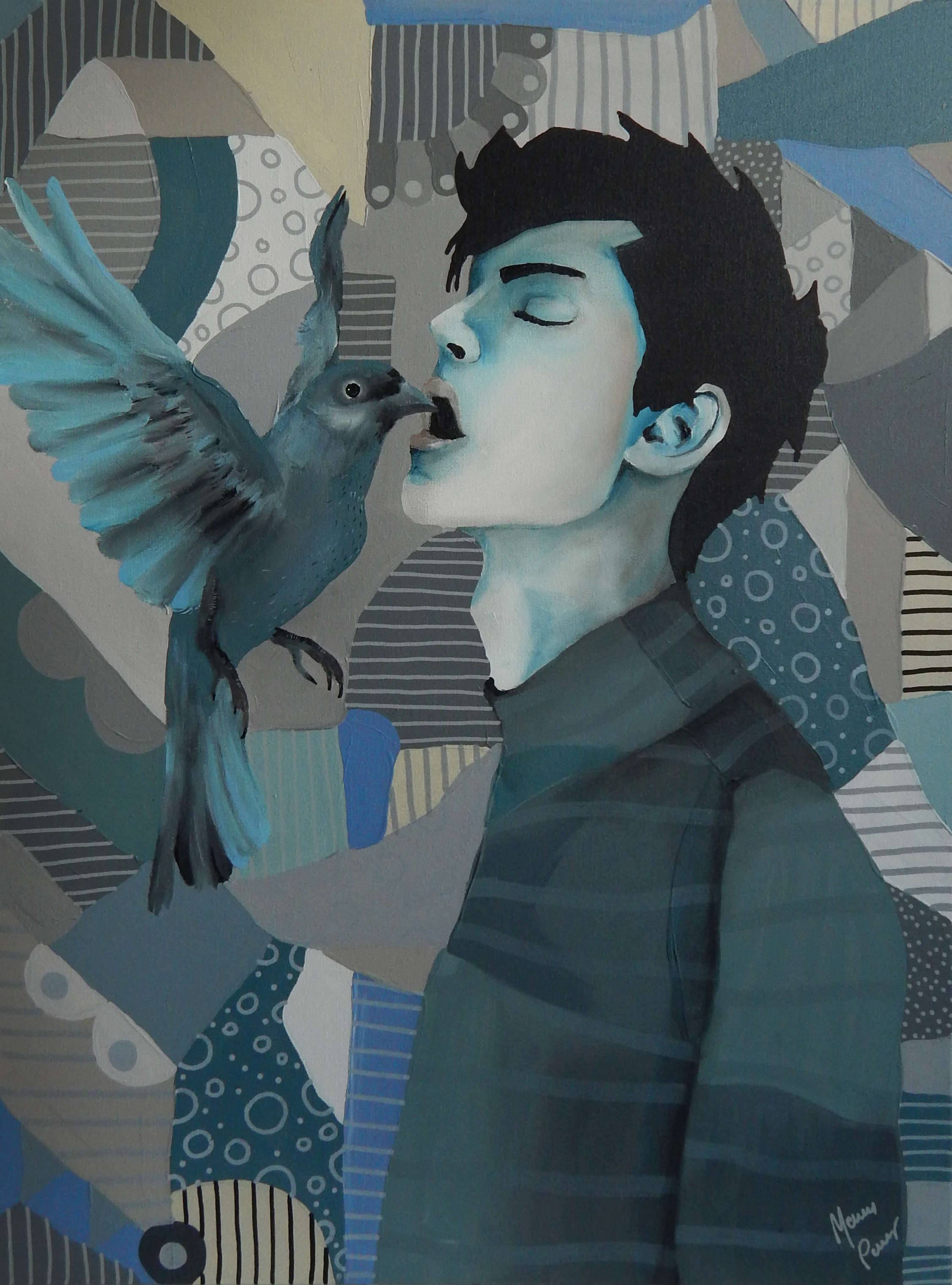 Obraz ten to prawdziwa mozaika kształtów i kolorów, z przewagą odcieni niebieskiego i szarości. Kluczową część sceny stanowi postać młodego mężczyzny, którego twarz styka się z dziobem ptaka. Kompozycja ma w sobie coś niezwykle intrygującego. Tło pełne geometrycznych wzorów dodaje chaotycznej harmonii i dynamizmu, jakby świat wokoło był w ciągłym ruchu. Atmosfera emanuje pewną magiczną ciszą, nasyconą odrobiną surrealizmu. Jest jak sen na jawie, marzenie na granicy jawy i snu. Styl obrazu przywodzi na myśl nowoczesną, abstrakcyjną ekspresję. Wydaje się, że artysta zgrabnie posługuje się pędzlem, swobodnie mieszając techniki i tworząc efekt głębi poprzez warstwowe nakładanie barw. Może to przypominać technikę collage, z elementami malarstwa figuratywnego. Gdy na niego patrzę, czuję wewnętrzny spokój, ale i napięcie. Niby nic, a jednak... Czy ptak karmiący człowieka to symbol wolności, czy jej braku? Dzieci powiedziałyby pewnie, że ptak przytulak się przytula, bo jest przyjacielski! Ten obraz to taka symfonia dla oczu, gdzie każdy element ma swoje miejsce i czas. It's mesmerizing, wciąga jak opowieść bez słów i zostawia z refleksją jeszcze długo po tym, gdy odwrócisz wzrok.