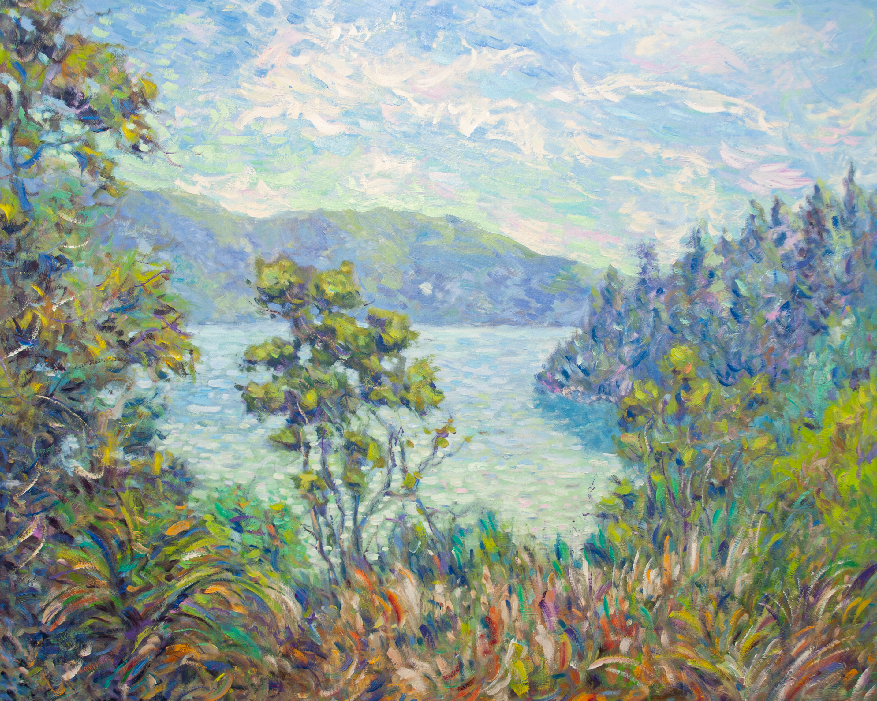 Obraz otwiera się jak okno na chłodne jezioro, gdzie migoczą mleczne błękity i seledyny. Po bokach piętrzą się kępy krzewów i traw wijących się w esy floresy, a w dali miękkie góry rozpływają się w lazurze. Kompozycja prowadzi oko do jasnego środka, bo tam światło rozlewa się wachlarzem krótkich pociągnięć. Pędzel pracuje szybko i nerwowo, z impastem i lekką dywizją plam, czysty impresjonizm z oddechem szkicu. Atmosfera jest wilgotna i przejrzysta, tak spokojna że aż chce się robić długii wdech. To jezioro jest jak wielka kałuża i bardzo błyszczy. Czuję równocześnie ukojenie i tęsknote, jakby lato odsuwało się o krok, a brzeg szeptał coś cicho. Kiedy patrzę dłużej, mam wrażenie że liście szumią, choć to przecież tylko farba. Ten pejzaż ma vibe i jednocześnie żyłkuje energią, więc człowiek gubi sie w barwach i pozwala myślom płynąć.