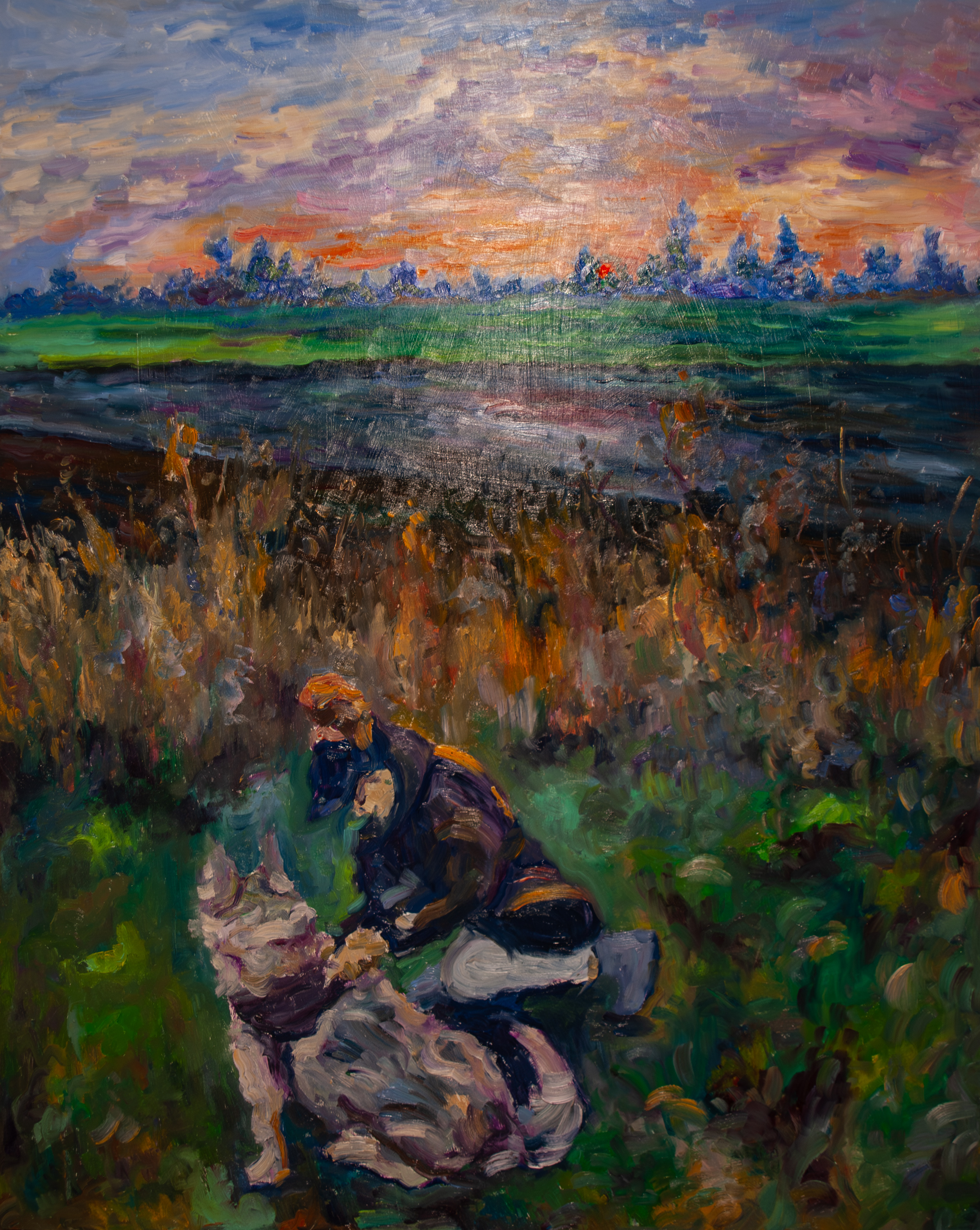 Na płótnie wibrują szerokie mazy farby, od fioletów i różów nieba po zielone pasy łąki, które przebiegają horyzontem niczym miękka taśma. W dole gęste kępy brązów i oliwek, wśród nich skulona postać przy jasnym psie, kompozycja opiera się na kontraście spokojnej panoramy i ruchliwego pierwszego planu. Gęsty impast, pociągnięcia mokre w mokrym, troche rozcierania, daje powierzchni migotliwą poświatę. Powietrze pachnie zmierzchem i ciszą, ale też lekkim drżeniem. Czuję tu czułość i może pożegnanie, takie pół na pół, bittersweet. Pies jest duży i dobry. Zastanawiam się, czy to chwilka odpoczynku, czy wspomnienie które właśnie się zsuwa, bo kolory aż się przeslizgują. Serio, trudno nie zatrzymać wzroku. I choć obraz wydaje się impresyjny, ma w sobie prawie reportażową szczerość, jakby ktoś mruknął do siebie i zgasił dzień.