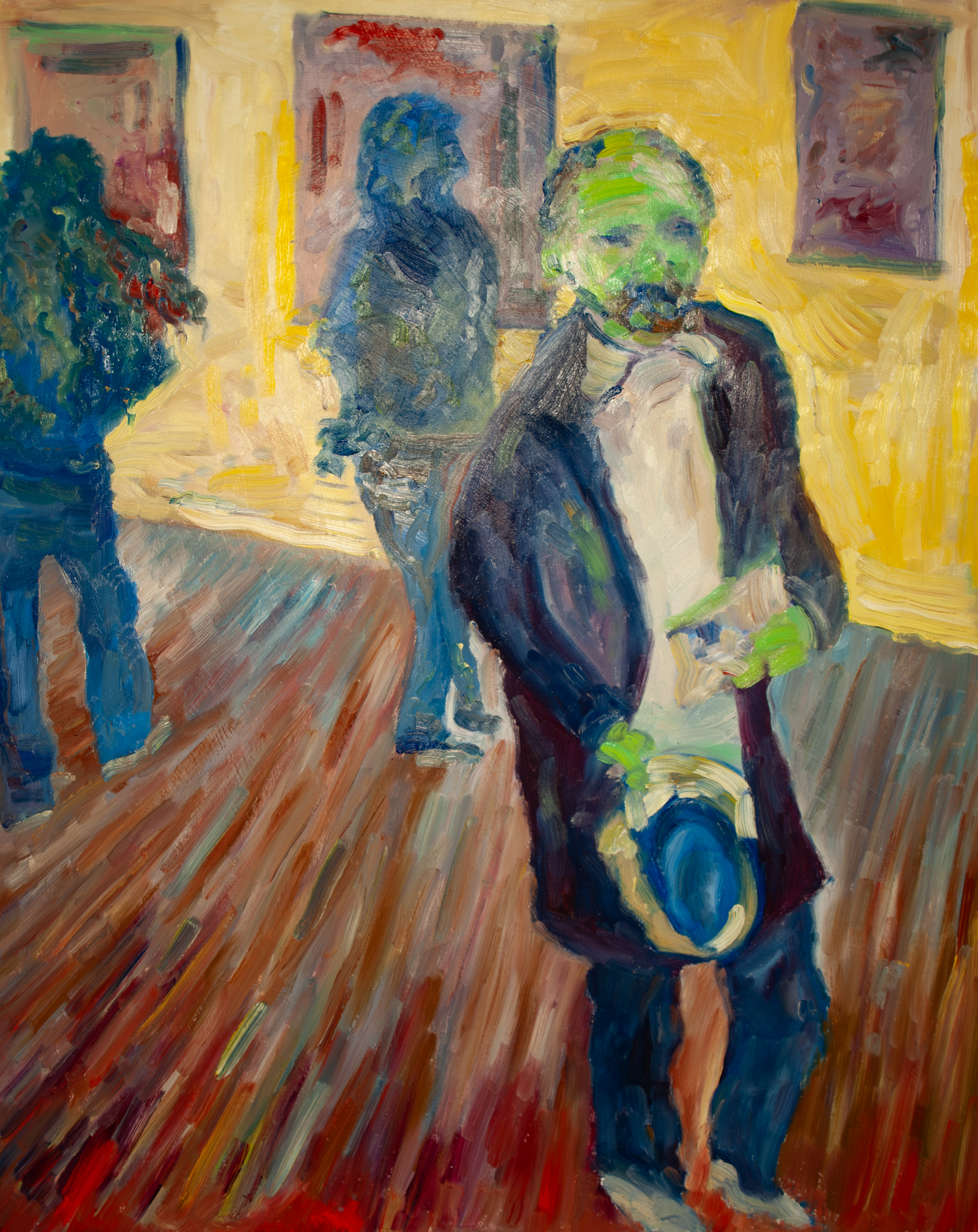 Na płótnie rozlewają się żółcie i rudości ścian oraz podłogi, w które wbito ukośne, pędzące pociągnięcia pędzla. Z lewej i w głębi stoją nieostre sylwetki, niby widzowie wystawy, a na pierwszym planie mężczyzna z zielonkawą twarzą ściska kapelusz. Pan trzyma kapelusz i wygląda jak z bajki. Kompozycja trójplanowa, z mocnym diagonem desek, daje ruch i lekki zawrót głowy. Atmosfera przypomina ciche muzeum po godzinach, troche samotne, trochę blurry. Gruba faktura farby, miejscami jak impasto, kładzie się grubymi smugami, zostawiając ślady szczotki jak rysy w pamięci. Styl ekspresjonistyczny, z celową deformacją postaci i kolorów, bardziej o uczuciu niż o poprawności. No i powiem szczerze, coś we mnie mięknie. Czuję niepokój i ciepło naraz, jak po rozmowie, która urwała się w pół zdania. Interpretuję tę scenę jako zawieszone przywitanie, chwilę przed decyzją czy wejść głębiej. A podłoga jakby pcha mnie do środka, naprawde.
