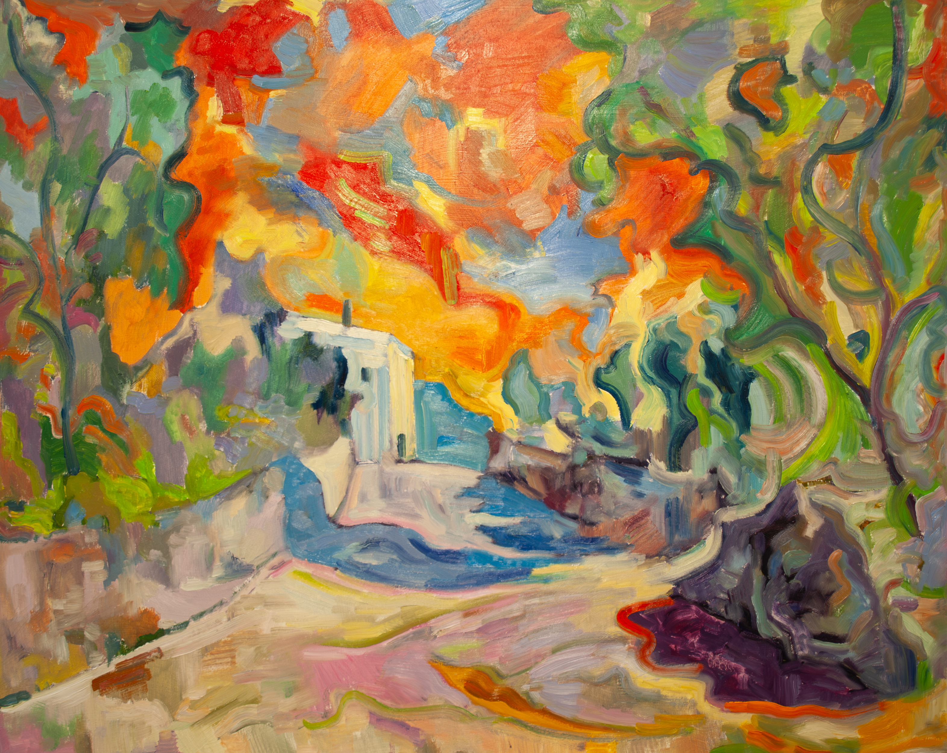 Na płótnie wybucha feria oranżów, zieleni i błękitów, poskręcane pociągnięcia tworzą falującą kompozyję. Po bokach drzewa wiją się jak dym, a w środku miga bielawe domostwo, spod którego ścieżka spływa ku purpurowemu cieniowi. Niebo jak płomienie, impasto i mokre w mokre zostawiają gęste ślady farby, serio wyczuwalne wzrokiem. Atmosfera gorąca i rozedrgana, a jednocześnie przyjazna, na prawdę jak wspomnienie lipca. Styl fowistyczno ekspresyjny, gest szybki, pędzel się ślizga i zrywa, widać rozcierki i małe celowe potknięcia. Chciałbym tam pobiec i skakać po kolorach. Patrzę i czuję niepokój oraz radochę naraz, całość ma wild vibe i mówi o ruchu i świetle, o miejscu które jest i trochę go nie ma.