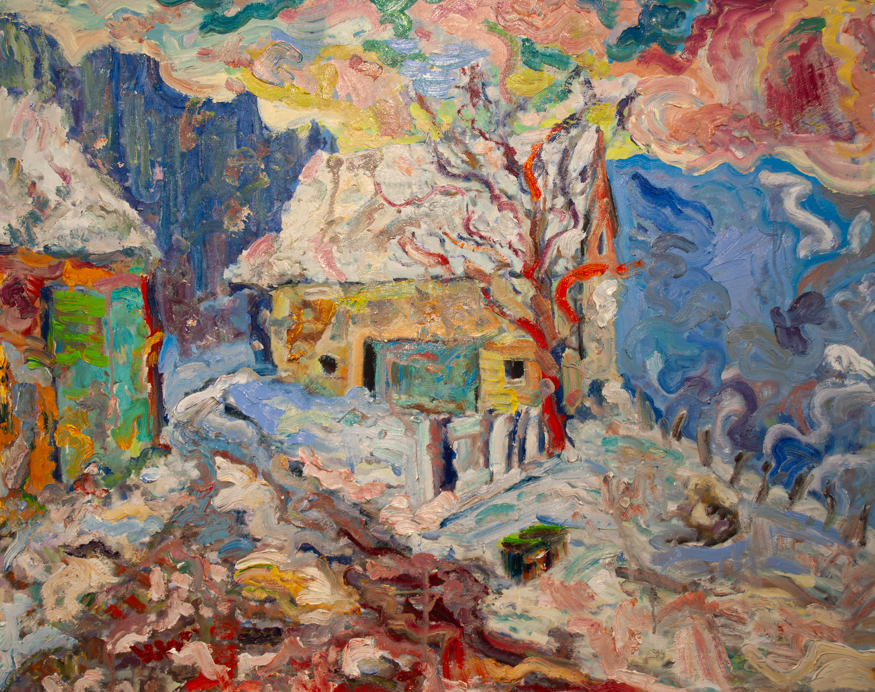 Na płótnie wirują turkusy i kobalt, podbite malinowymi chmurami oraz smugami bieli i ochry. W centrum mały domek z zasypanym dachem, obok drzewo jak płonący znak z czerwonymi żyłami. Śnieg jest gęsty i kremowy, pofalowany, jakby grany szpachlą i ciężkim impastem. To jest domek w śniegu i jest miło. Atmosfera niespokojna, ale przytulna, taki miks ciszy i kipiącej energii, trochę marzenie, trochę real. Malarskość ekspresjonistyczna, pociągnięcia krótkie i szarpane, miejscami rozlewajce się jak dym. Czuję zapach farby, serio, i jakos naprawdee widzę mróz, choć to tylko obraz, bardzo vibrant. Mówi mi o cieple schowanym w środku i o zimie co wymusza wytrwałość, więc wracam pamięcią do własnych spacerów.