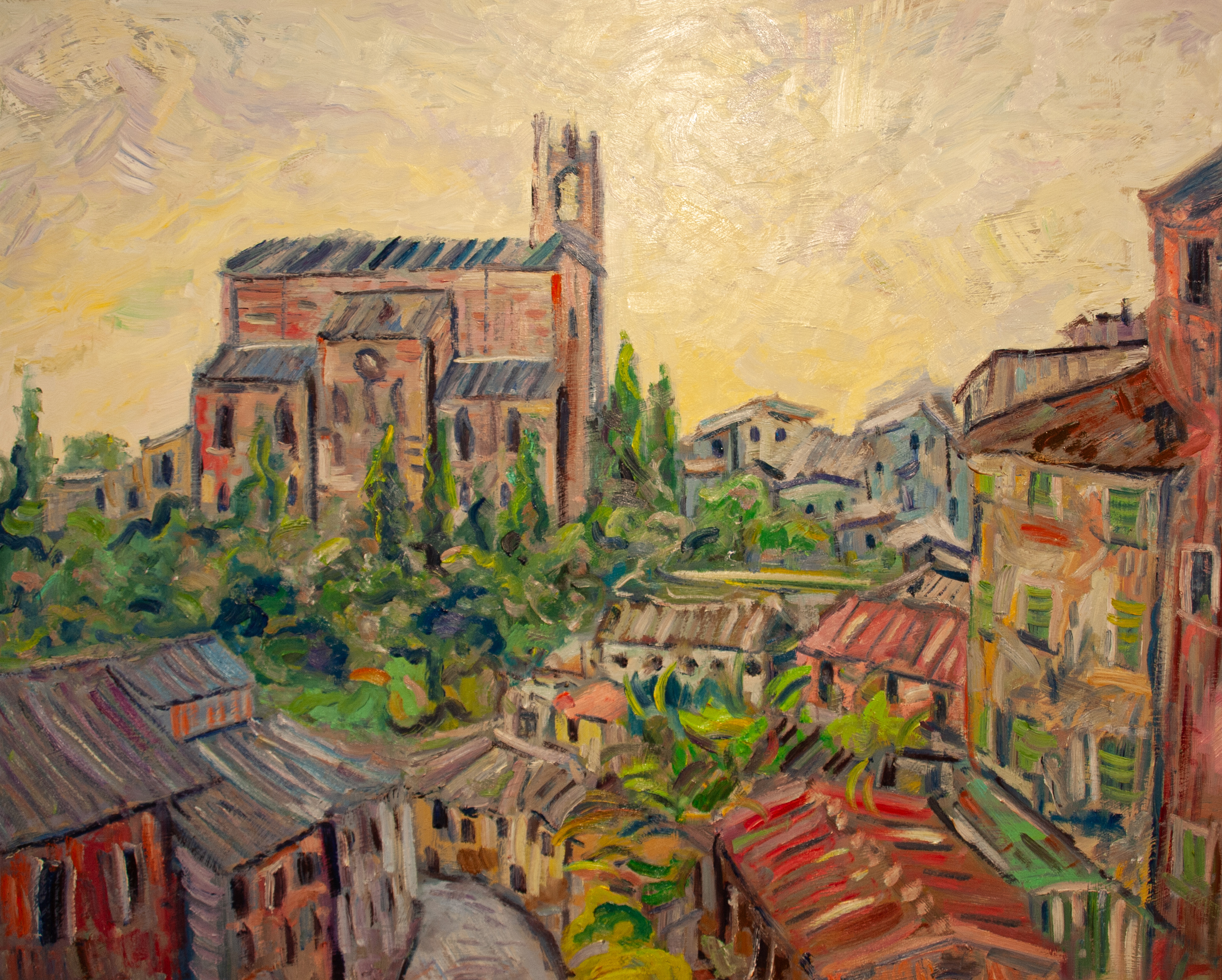 Na płótnie rozlewa się złota mgiełka nieba, pod którą wyrasta masywna bryła kościoła i pofałdowana wstęga dachów. Pociągnięcia pędzla są krótkie i łamane, jakby artysta kroił kolor w kostkę, mieszał oliwkową zielen z ceglastą czerwienią i grafitowymi dachami. Kompozycja prowadzi wzrok z dołu po ukośnych uliczkach prosto ku wieży. Atmosfera popołudnia, ciepła i zadumana, ma vibe. To postimpresjonistyczna narracja, impast i wyraźna faktura, rytm grubo kładzionych plam, które drgają na krawędziach. Krawędzie domów są rozchwiane, troche rozmemłane, ale trzymają pion jak stare mury. Serio, te bliki na dachach aż mrugają. To wygląda jak duży zamek i ma czerwone dachy. Myślę o miasteczku żyjącym obok świątyni, o pamięci, co sie gubi i wraca. Taki obraz do patrzenia, nie do gadania.