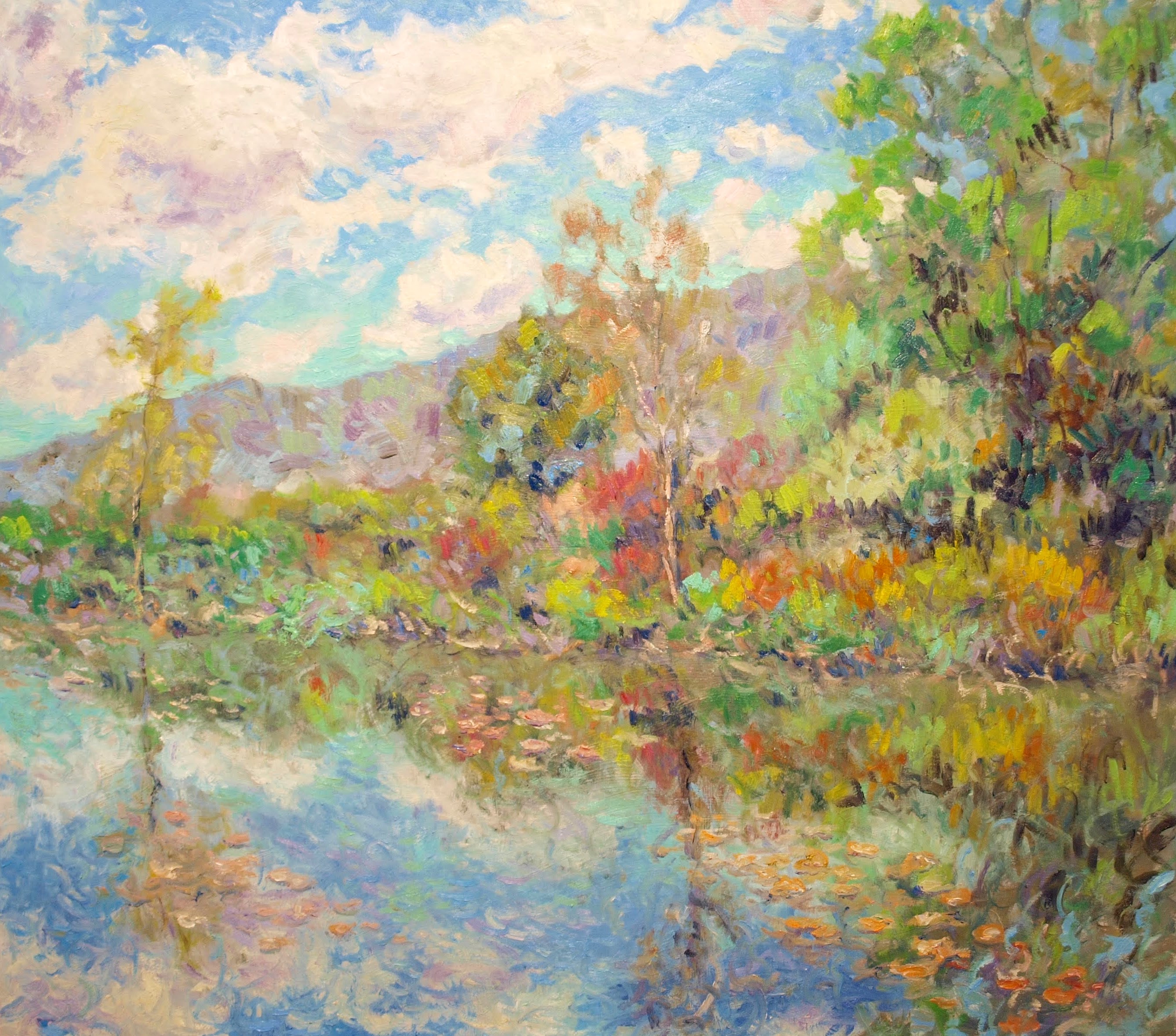Na płótnie rozlewa się pejzaż jak z późnego lata. Niebieskie niebo z mlecznymi chmurami układa się w miękkie plamy. A poniżej woda bierze to wszystko w lustrzane odbicie i miesza z zielenią i fioletem. Po prawej kłębi się gęsty brzeg z drzewami. Pociągnięcia pędzla są krótkie i drżące. Trochę jak impresjonizm. Kolory. Żółcie. Rudości. Zielenie. Robi się ciepło i spokojnie jakby świat na chwilke przestał się spieszyć. Ja bym tam usiadł i patrzył bez gadania. To jest magiczne jak w bajce. W tych rozmazanych konturach czuję nostalgiczną radość i taki cichy zachwyt. Ten soft shimmer na wodzie aż mruży oczy. Kompozycja prowadzi wzrok w głąb ku sinym wzgórzom i zostawia w głowie miłe zamieszanie.