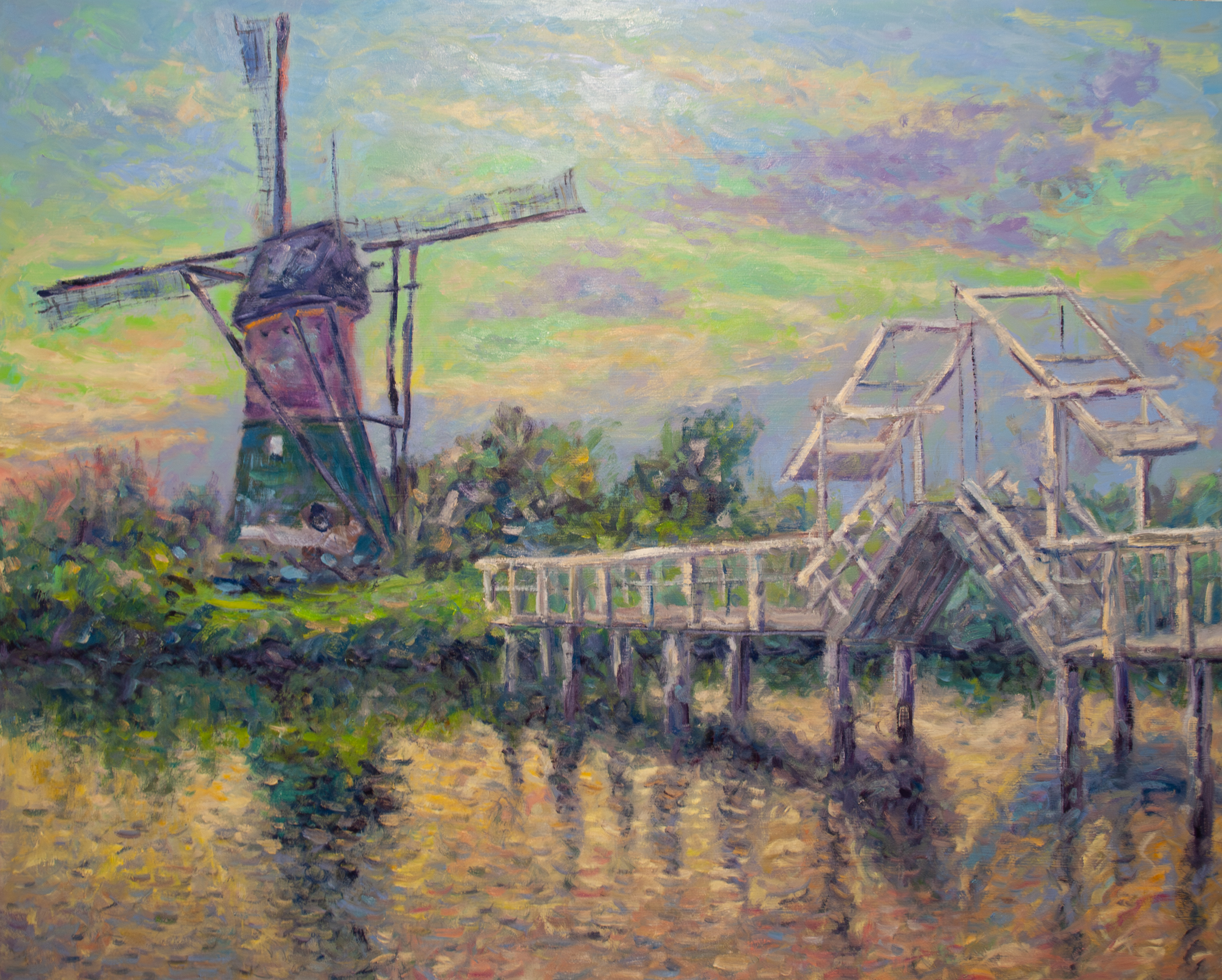 Na płótnie rozlewa się pastelowy zmierzch, zgaszone fiolety i limonkowe zielenie przecinają niebo. Po lewej stary wiatrak kołysze ramionami, po prawej chudy most zwodzony składa się jak origami nad wodą. Grube, impresjonistyczne pociagniecia pędzla kładą się krótkimi smugami, a faktura farby aż skrzypi. Odbicia migoczą, złocą się i troche drżą, jakby powietrze było gęste. To jest wiatrak i mostek nad wodą i bardzo mi się podoba. Atmosfera spokojna, lecz nie całkiem. Czuję wyczekiwanie, może zaraz popłynie łódź. Styl bliski plenerowi, luźny, troche niechlujny i świetny. W tle lekka melancholia i ciepło wspomnienia. Całość ma dreamy połysk poranka.