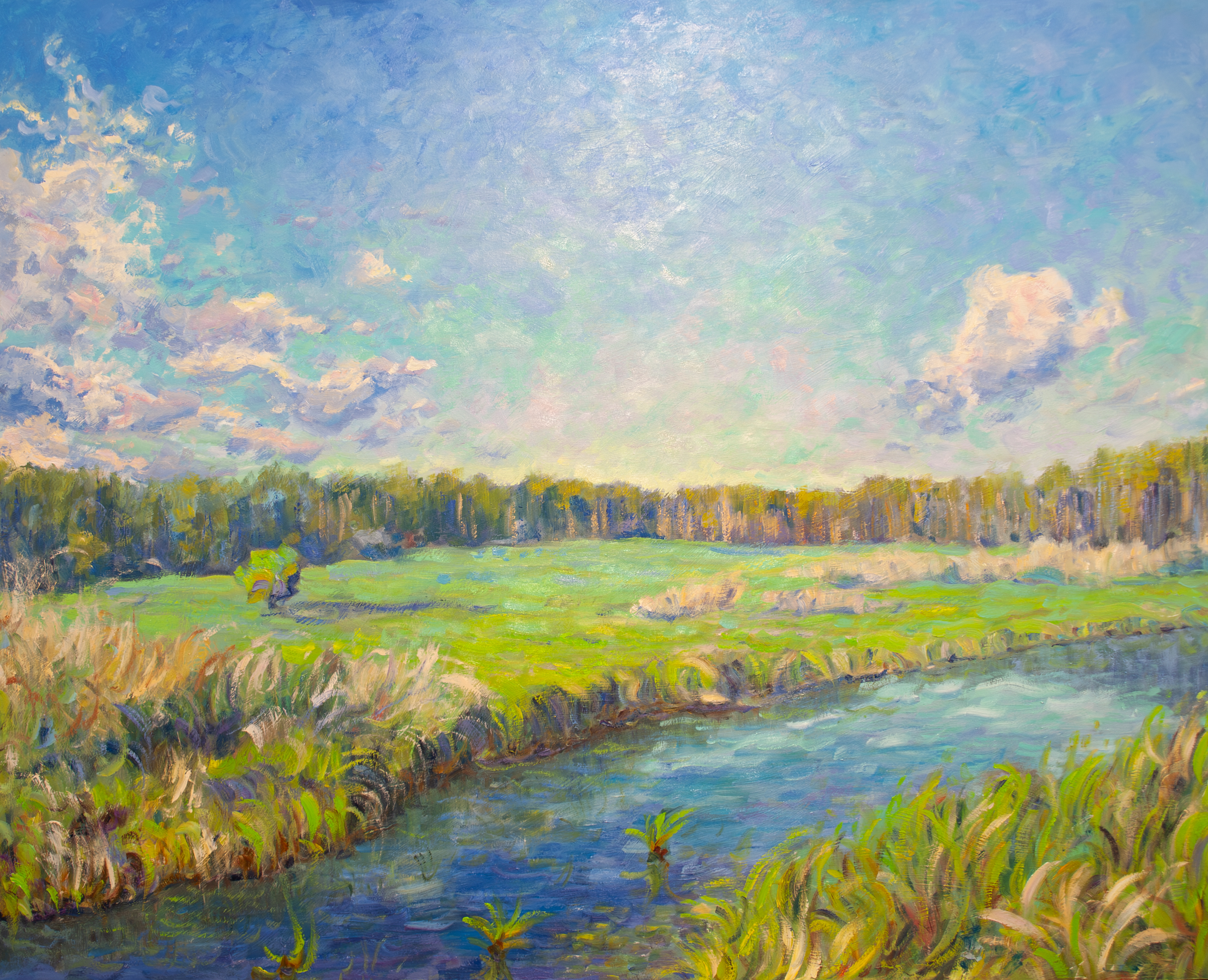 Na obrazie rozlewa się szerokie niebo w chłodnych błękitach i mlecznych różach. Poniżej biegnie diagonalny kanał wody. Lśni jak szkło i przecina zielone łąki. Brzeg pulsuje kępami traw i ostrych liści. W oddali stoi pas lasu tworzący wyraźny horyzont. Kompozycja otwarta i oddechowa. Pędzel krótkie plamy i miękkie impasto. To czysty impresjonizm i światło gra tu pierwsze skrzypce. Nastrój jest pogodny ale z nuta melancholii. Czuję spokój i dziwne ciepło w klatce. Chciałbym skakać po tej trawie i robić chlup w wodzie. Tekstura wibruje i ma małe drgniecia jakby powietrze falowało. Czas zwalnia i robi się glow. Troche krzywo a jednak pieknie. Patrzę i chce się oddychać głębiej.