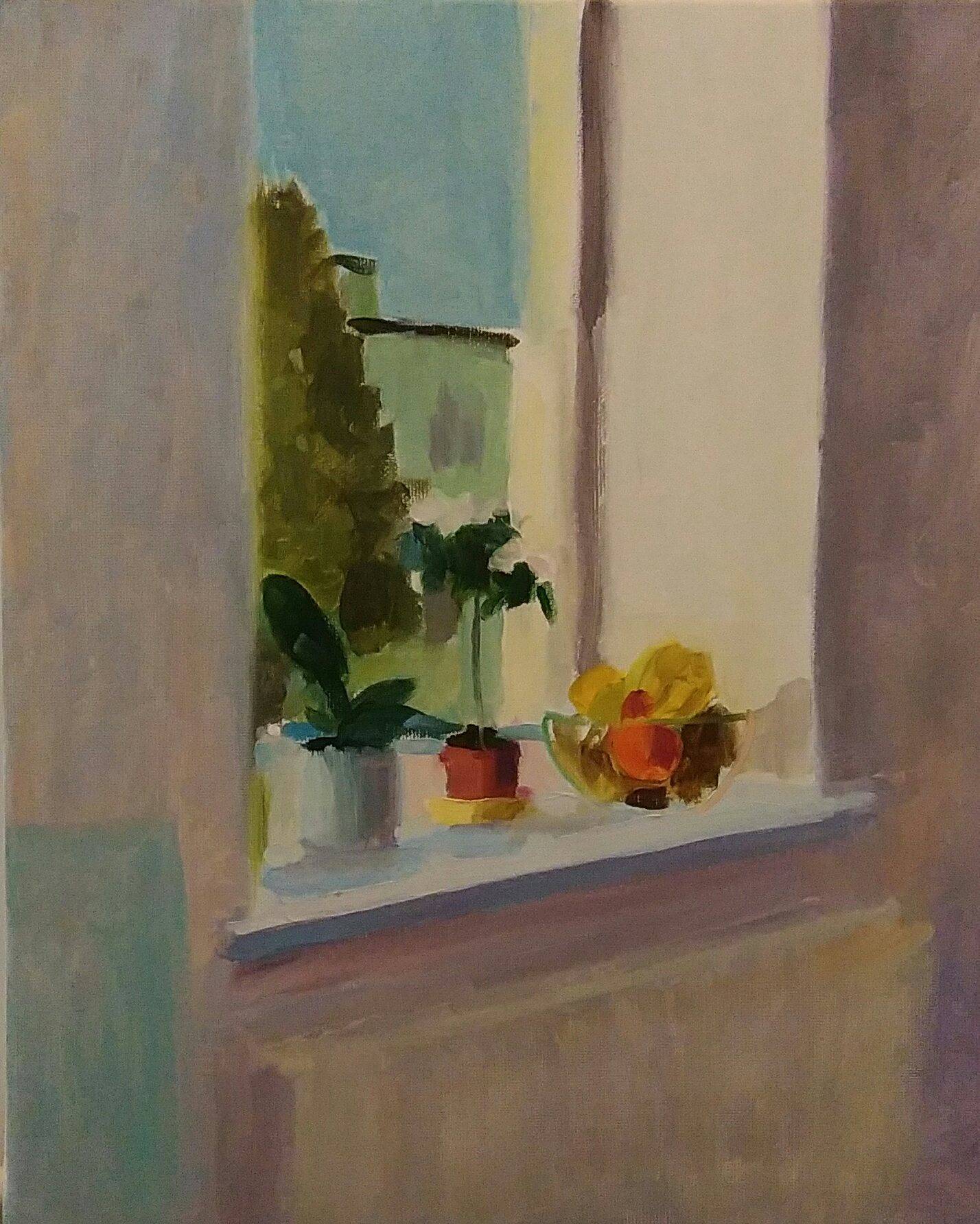 Obraz przedstawia uroczy zakątek parapetu, na którym tętnią życiem zielenie i ciepłe odcienie owoców. Delikatne pociągnięcia pędzla tworzą kompozycję, w której nasz wzrok przyciąga miska z owocami. Kształty są lekko rozmyte, co nadaje scenie subtelności i ulotności. Pomarańcze, banany i inne smakołyki krzyczą o świeżość i zdrowie. Ach, taki widok z okna to prawdziwy peace of mind! Atmosfera obrazu jest spokojna i trochę sielska. Jakby czas przystanął tylko po to, byśmy chwilę pomedytowali nad prostotą tej scenki. Obraz emanuje spokojem, a zarazem ciepłym światłem poranka. Styl artysty jest impresjonistyczny, z rozmachem pociągnięć, który uwydatnia grę światła i cienia. Kolory są pastelowe, miękkie, niemalże rozmyte, co sprawia, że całość jest delikatna, jakby namalowana trochę we śnie. Kiedy patrzę na ten obraz, czuję spokój. Jakbym siedział przy oknie z kubkiem herbaty w ręku. "Oj, chce mi się takiego widoku codziennie!" mogłoby powiedzieć dziecko. Artysta w zręczny sposób wywołuje nostalgię, przypominając o prostych przyjemnościach codzienności. Ten obraz to prawdziwe przypomnienie, że piękno tkwi w tym, co zwyczajne i niepozorne.