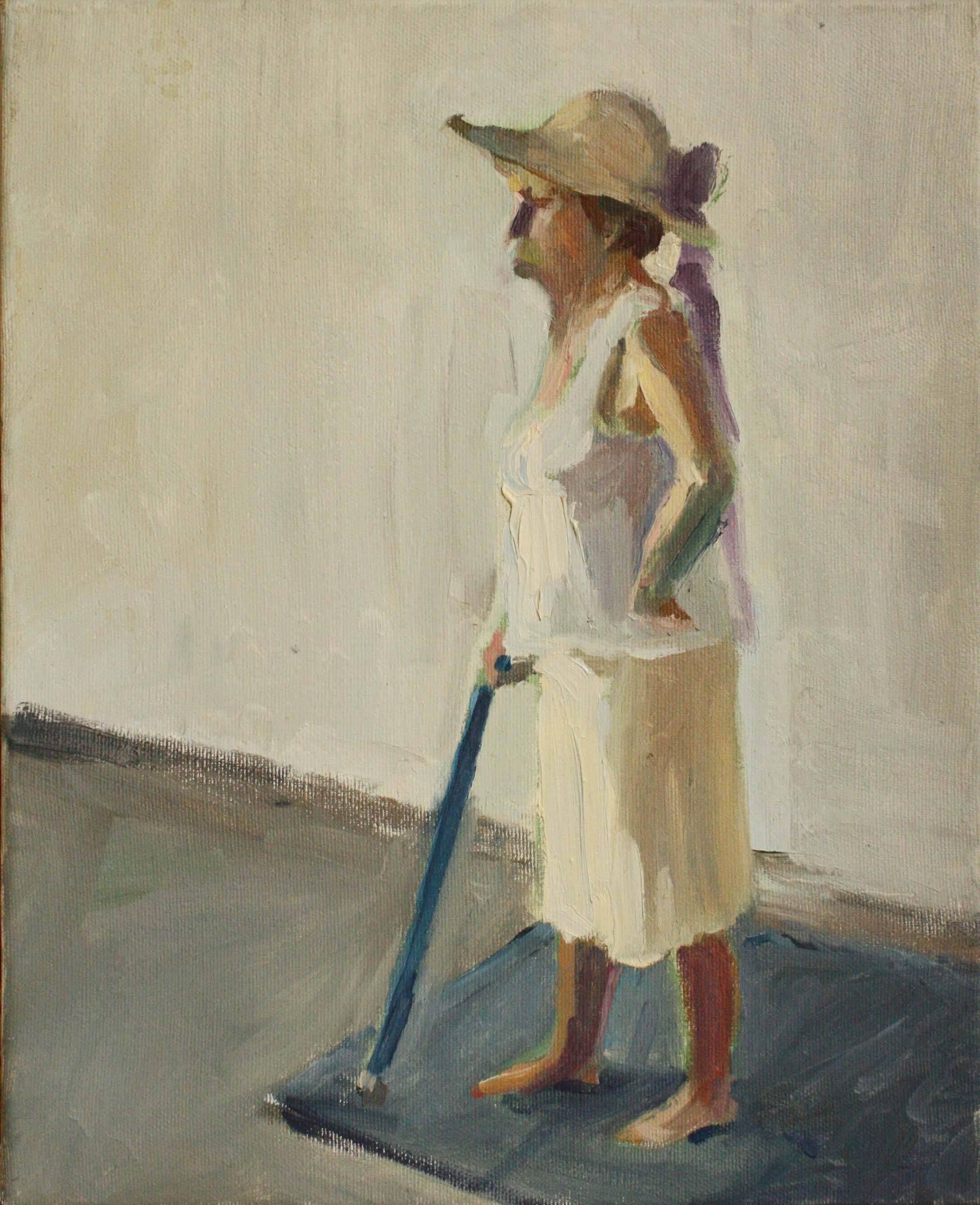 Na obrazie widzimy postać kobiety, która stoi boso na ciemniejszym tle, może to być kawałek podłogi, w ręce trzyma niebieską laskę. Ubrana jest w jasną sukienkę i kapelusz, który rzuca cień na jej twarz. Kolory są stonowane, jest duużo odcieni szarości i beżów, co nadaje pracy spokojny i nieco melancholijny nastrój. Pociągnięcia pędzlem są miękkie, delikatne, jakby artysta malował z czułością, a może trochę pośpiesznie. Atmosfera obrazka przyciąga swoją prostotą. Kobieta zdaje się zamyślona, może nawet lekko smutna. To ten rodzaj obrazu, który sprawia, że zastanawiasz się, kim ona jest, jaka jest jej historia. Może jest zmęczona długim spacerem, a może to po prostu leniwy dzień. Technika zastosowana przez twórcę jest wyrazista. Widać, że użył techniki alla prima, malując na mokro – paint fresh and fast. Obraz działa na emocje, przywołując skojarzenia z codziennością, ale też z czymś intymnym, osobistym. Jednocześnie bije z niego spokój, który, o dziwo, jest całkiem zaraźliwy. Patrzysz na ten obraz i myślisz: „Hej, fajnie jest tak czasem bez pośpiechu, prawda?”. A pewna prostolinijność całej sceny przywołuje uśmiech na twarzy, tak jak to zdanie, które mogło by napisać dziecko: "Ta pani chyba czeka na przyjaciela!". Emocje i interpretacje są otwarte, każdy może tu znaleźć coś swojego. Artysta z pewnością uchwycił moment wart refleksji.