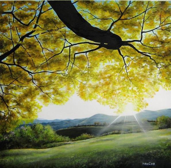 Na obrazie dominuje ciepła paleta barw, z wyraźnymi odcieniami złota i zieleni. Duże, rozłożyste gałęzie drzewa z żółtymi liśćmi tworzą naturalną markizę nad krajobrazem. W tle majaczą delikatne wzgórza, skąpane w porannym świetle. Kompozycja przypomina letni poranek, gdzie można poczuć delikatne muśnięcie słońca na twarzy. Nastrój dzieła jest niezwykle uspokajający, jak kojący szum liści w wietrze. Artysta zastosował realistyczny styl z nutą impresjonizmu, widoczną w rozmytych konturach liści, co dodaje ruchu i dynamiki. Ten obraz może budzić w widzu różne emocje. Może to być nostalgia za letnimi dniami spędzonymi na łonie natury, a może pragnienie ucieczki od zgiełku codzienności. Technika gry światła, które przenika przez liście, tworzy efekt magiczny, wręcz ethereal. "Wow, ale fajne drzewo!" mogłoby powiedzieć dziecko patrzące na ten obraz. Osobiście czuję spokój, może nawet trochę zazdrość, że nie mogę być tam teraz. Wyobrażam sobie, że to miejsce pełne jest tajemnic, które czekają na odkrycie. Chciałbym przycupnąć pod tym drzewem i po prostu nic nie robić. Ten obraz to jak cichy szept natury, który mówi "zatrzymaj się i poczuj".