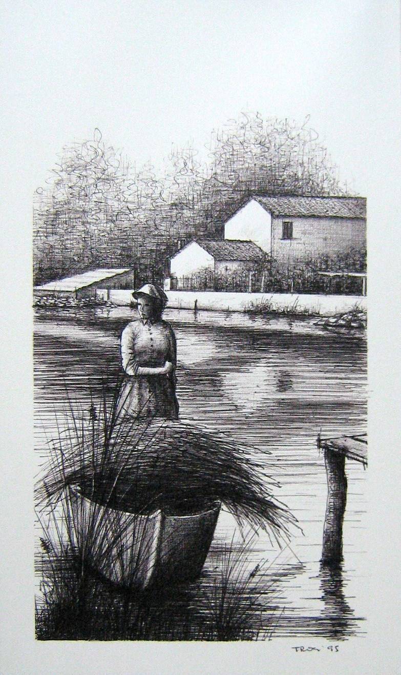 Czarno-biały szkic przedstawia subtelną scenę za wsią, z kobietą stojącą nad wodą. Linie tworzące krajobraz są delikatne, a jednocześnie precyzyjne, jakby artysta chciał uchwycić ulotność chwili. Zarysowane domy w tle wznoszą się majestatycznie, dając wrażenie spokoju i harmonii. Kobieta w szerokim kapeluszu daje poczucie zadumy. Patrząc na ten rysunek, możemy poczuć melancholię i ciepło jednocześnie. Czy to zachód słońca, czy może wczesny poranek? Te pytania rodzą się w naszej głowie w miarę, jak wpatrujemy się w obraz. Styl artystyczny przypomina mieszankę impresjonizmu i realizmu. Krótkie, dynamiczne kreski oddają ruch roślin na pierwszym planie. Technika artysty to przede wszystkim gra światłocieniem, która nadaje rysunkowi głębi. Czujemy, że to nie jest tylko obrazek, a część opowieści, którą każdy może sobie dopisać. Młody widz mógłby krzyknąć: "Hej, ona czeka na łódkę!". Wzbudza pewną nostalgiczną tęsknotę za prostym życiem, gdzie czas płynie wolniej. To dzieło sprawia, że czujemy się częścią tego małego, idyllicznego świata. Jakbyśmy na moment zapomnieli o zgiełku codzienności. Magiczne, prawda?