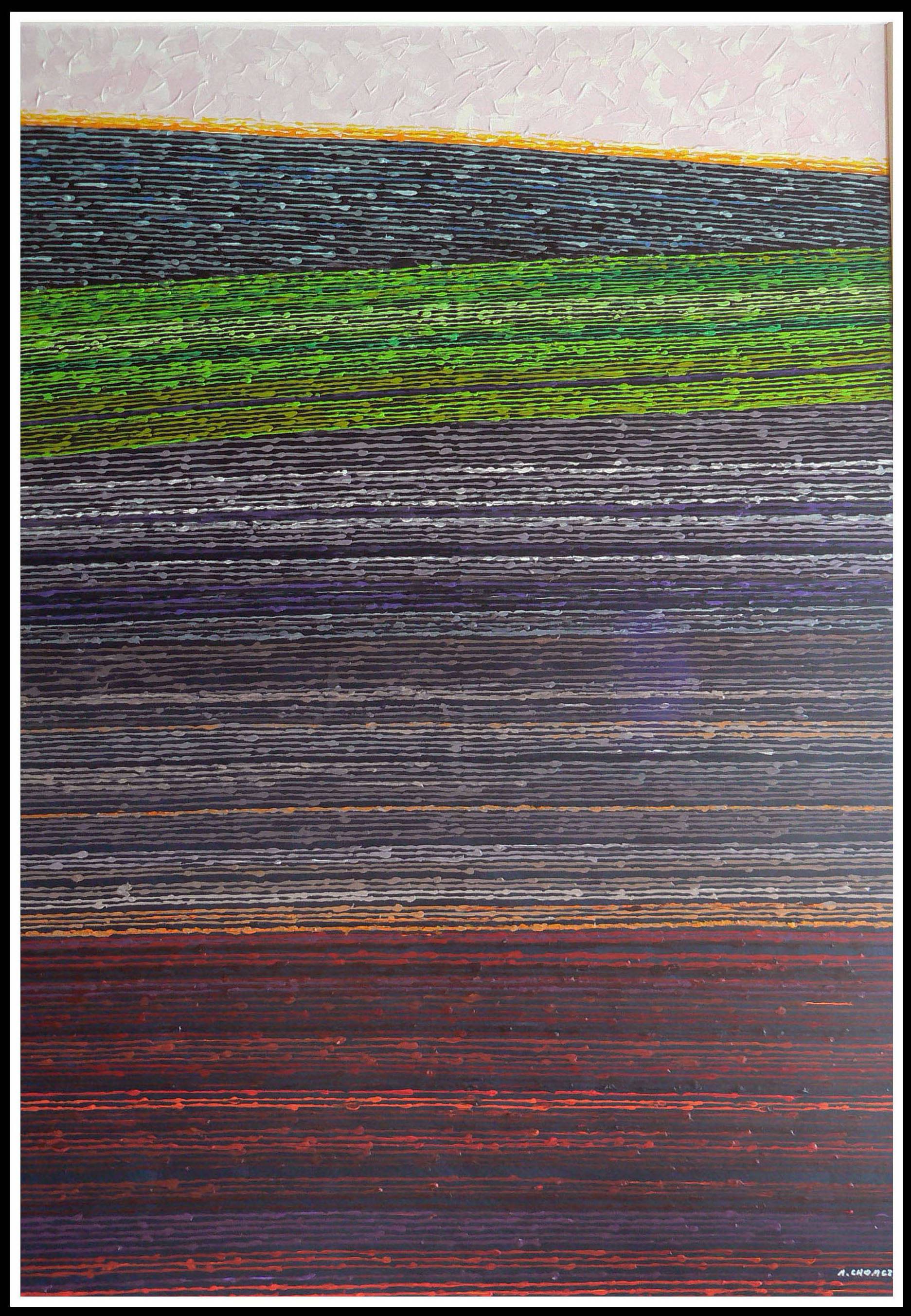 Obraz ukazuje dynamiczną kompozycję pełną poziomych linii, które tworzą rytmiczny krajobraz. Feeria barw obejmuje odcienie zieleni, szarości, czerwieni i subtelne nuty żółci, co dodaje głębi i tekstury. Kształty są proste, lecz ich rozmieszczenie przyciąga wzrok i sugeruje płynny ruch. Atmosfera dzieła jest spokojna, ale jednocześnie pełna intensywności, jakby oddawała nieustanną, choć niewidoczną energię. Styl artystyczny przypomina abstrakcję ekspresyjną, z wyraźnym naciskiem na teksturalne i kolorystyczne kontrasty. Artysta posłużył się techniką impastu, nadającą pewną trójwymiarowość powierzchni obrazu. Patrząc na to, czuję się jakbym oglądał świat przez kalejdoskop emocji. Wow, takie trochę magiczne. Obraz budzi różnorodne emocje. Dla jednych może to być spokój wieczornego horyzontu, dla innych tętniąca życiem łąka. Myślę sobie: "To jak widok z kosmosu". Te kolory dodają magical touch, niemal jakby ta scena była częścią czegoś większego. Czuję się zainspirowany, jakby każda linia opowiadała inną historię. Coś w tym obrazie przyciąga wzrok i zmusza do przemyśleń. Nieco nostalgiczny, ale w dobrym tego słowa znaczeniu. To nie tylko widok, ale i uczucie zaklęte w barwach.