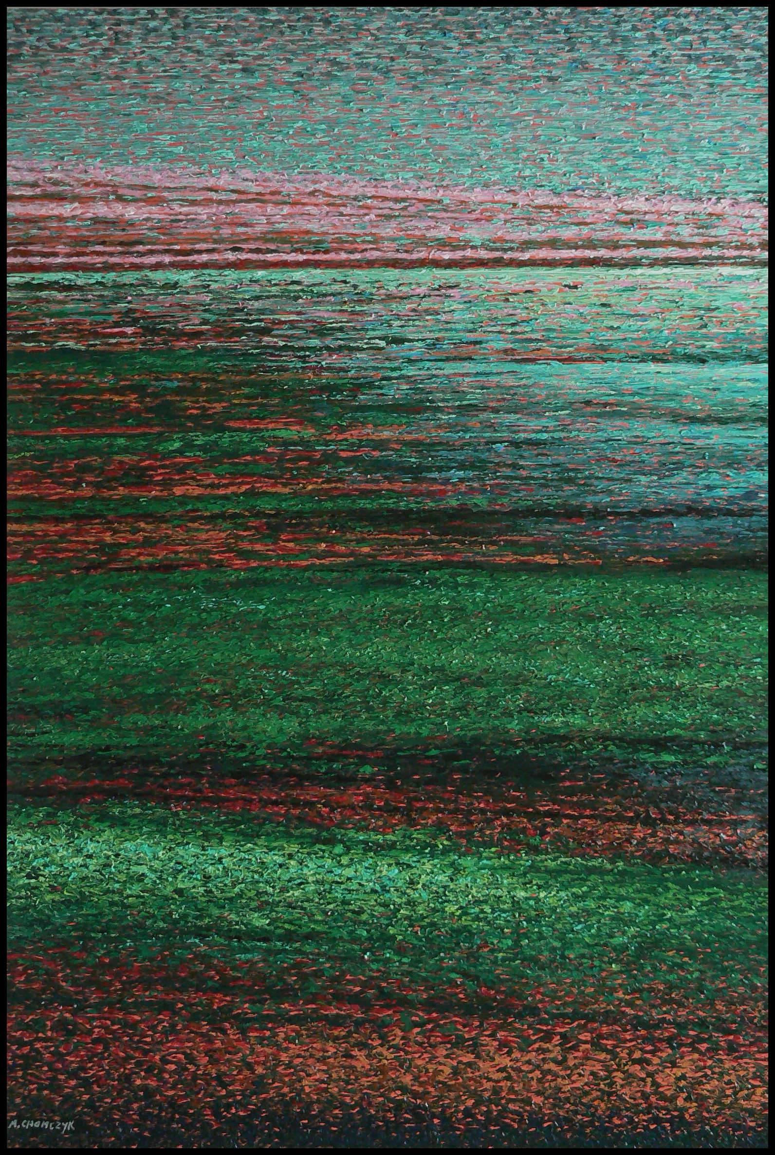 Obraz jest pełen ruchu i eksplozji kolorów. Zielone pasma przeplatają się z czerwonymi, tworząc dynamiczny krajobraz pełen głębi i tajemnicy. Kompozycja jest niemal hipnotyzująca, z przewagą poziomych linii, które przypominają rozległe pola czy falujące morze pod delikatnym wiatrem. Przypomina to trochę moment, kiedy na łąkę pada światło zachodzącego słońca, a wszystko wokół nabiera magicznego blasku. Nastrój tego obrazu jest raczej nostalgiczny, ale jednocześnie pełen życia. Można poczuć radość, jaką daje natura w jej pełnym rozkwicie. To trochę tak, jakby ktoś zatrzymał czas w jednej chwili piękna. Styl artysty przypomina nieco pointylizm, z małymi, wyrazistymi kroplami farby układającymi się w skomplikowany wzór. Taka technika nadaje dziełu teksturę i bogactwo, które magnetyzuje wzrok. Dla odbiorcy obraz może być źródłem refleksji o ulotności chwili i pięknie codziennych widoków. Można też doszukać się w nim symboliki harmonii między człowiekiem a naturą. Ja sama czuję spokój, patrząc na ten pejzaż, ale i pewną tęsknotę za czymś nieuchwytnym. Trochę jakby to było magic. Mój braciszek powiedziałby: "To wygląda jak pole, po którym biegają kolorowe motylki!". I trudno się z nim nie zgodzić.