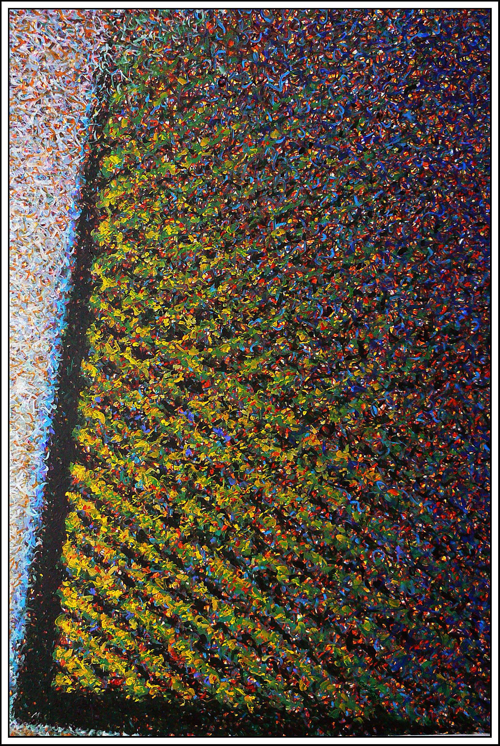 Obraz przyciąga wzrok feerią barw i zaskakującą kompozycją. Głębokie odcienie żółci, zieleni i czerwieni tworzą mozaikę drobnych plam, które zlewają się w dynamiczny wzór. Kompozycja jest asymetryczna, lewa część zdominowana przez jasne, niebiesko-białe akcenty, podczas gdy reszta tętni ciemniejszymi tonami. Wszystko to sprawia, że na pierwszy rzut oka obraz wydaje się wręcz pulsować życiem! Artysta zastosował technikę pointylizmu, tworząc rój maleńkich kropek, które z bliska wyglądają chaotycznie, lecz z dystansu układają się w harmonijną całość. Przypomina to układanie puzzli, gdzie każdy kawałek pasuje idealnie. To trochę jak magiczne zaklęcie. W odbiorcy może budzić różnorodne emocje—od zachwytu nad pięknem koloru, po refleksje nad chaosem i porządkiem. Look, obraz wydaje się prawie muzyczny w swojej ekspresji. Ciepło i energia barw mogą kojarzyć się z pełnym życia ogrodem o zachodzie słońca, a kontrasty—z cieniami, które kreślą tajemnicze wzory na ziemi. Mały Michaś powiedziałby: "To jest jak wirująca tęcza!" I trudno się z nim nie zgodzić. Całość emanuje poczuciem nieokreślonej, pozytywnej energii, która przyciąga jak magnes. Dla mnie ten obraz to metafora życia—pełnego kolorów, nieprzewidywalnego, ale ostatecznie fascynującego w swojej złożoności.