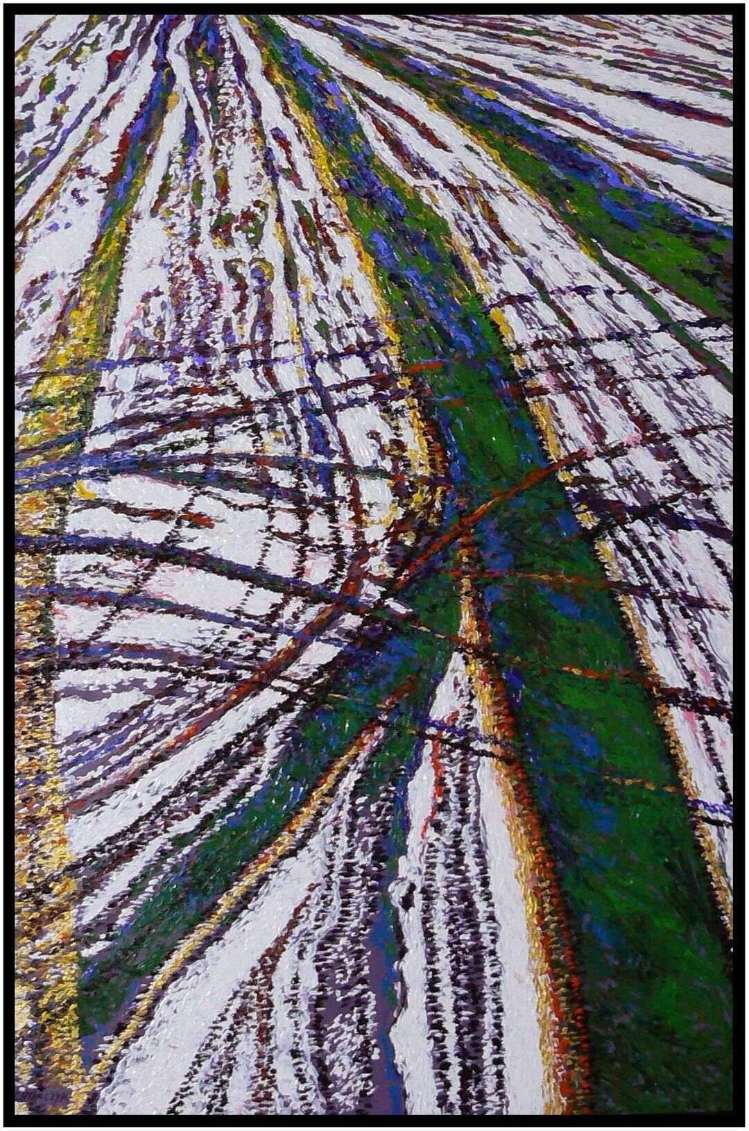 Obraz przedstawia dynamiczną kompozycję pełną kolorów i energii. Linie, krzyżujące się i przecinające na białym tle, tworzą fascynującą sieć abstrakcji. Dominujące zielenie i fiolety mieszają się z błękitami i czerwieniami, tworząc intensywny kontrast. Wszystko zdaje się poruszać, jakby scena była uchwycona w ruchu. Atmosfera obrazu to intryga i chaos, coś jak przebłysk chwili zatrzymanej w czasie. Styl artysty przypomina technikę impasto, gdzie grubo nakładana farba tworzy fakturę trójwymiarową. To jakby kolorystyczna symfonia rozgrywała się na płótnie. Patrząc na to, czujesz jak niespokojny umysł szuka porządku w chaosie. Ten obraz wydaje się wołać: freedom. Dziecko powiedziałoby: "To takie kolorowe i wygląda jak torby, które bawiań się w parku." Artysta eksperymentuje z formą, inspirując odbiorcę do głębszych refleksji. Obraz wywołuje emocje, od niepokoju po zachwyt. Zachęca do poszukiwania ukrytych znaczeń. Fascynuje intensywnością i narracją, której słowa nie oddadzą. Z każdym spojrzeniem odkrywasz coś nowego, jak niezwykłą podróż w świat abstrakcji.