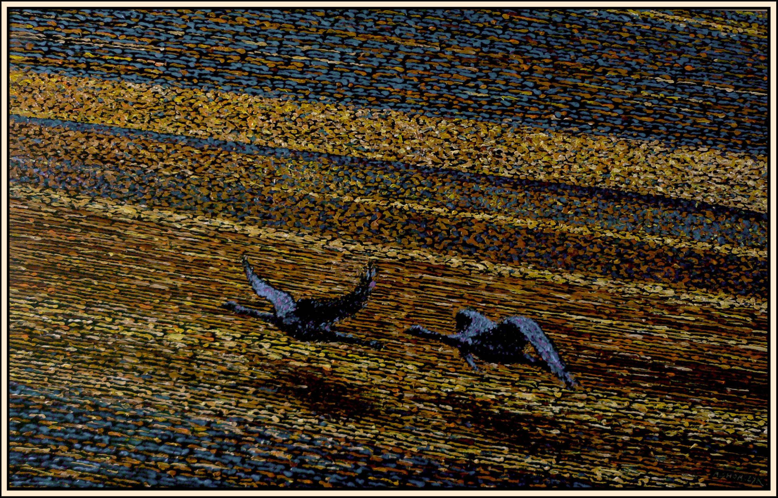 Obraz przedstawia dynamiczną scenę, w której dwie sylwetki ptaków unoszą się nad pofalowanym pejzażem. Dominują złote i niebieskie odcienie, które tworzą niesamowitą mozaikę barw. Kolory harmonijnie przenikają się, tworząc iluzję ruchu. Kompozycja jest horyzontalna, co nadaje pracy poczucie przestrzeni i głębi. Atmosfera obrazu jest pełna spokoju, ale jednocześnie emanuje energią wynikającą z ruchu ptaków. Artysta zastosował technikę pointylizmu, stawiając tysiące małych kropek, które z daleka łączą się w wyraźne formy. Ten styl jest trochę jak magiczne puzzle, gdzie każda kropka ma swoje miejsce. Obraz może budzić w widzach różne emocje. Dla jednych to symbol wolności, dla innych melancholia odlatujących ptaków, przypominająca o przemijaniu chwili. „Ptaki lecą dziarsko” mogłoby powiedzieć 7-letnie dziecko. W tym dziele jest coś poetyckiego, co zachęca do zadumy i osobistej refleksji. Jakby każdy mógł dodać własne „story” do tej opowieści. Magiczny klimat i subtelne przejścia między kolorami sprawiają, że patrząc na obraz, przenosisz się do innego świata.