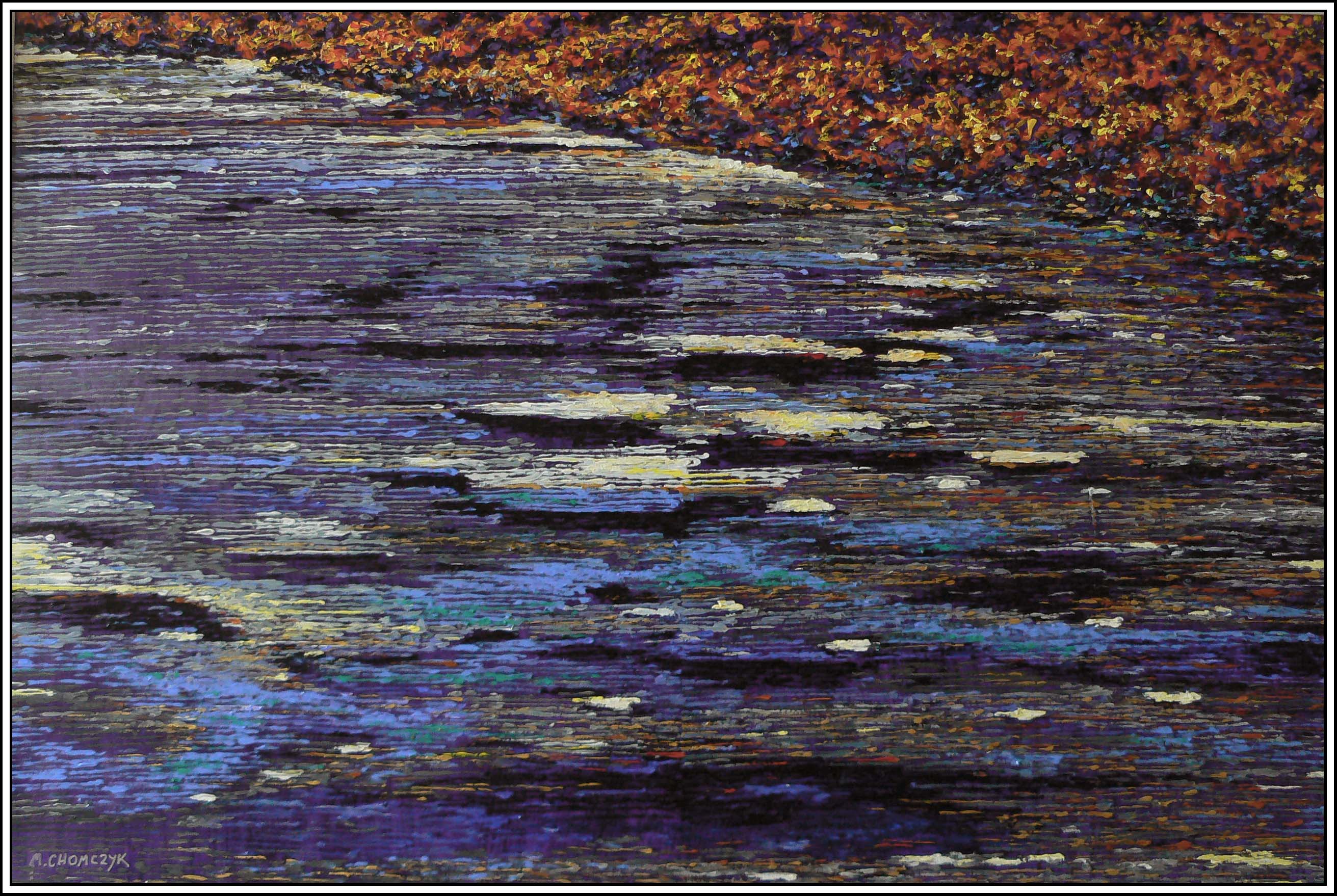 Na obrazie dominuje piękna gra kolorów, gdzie fioletowe i niebieskie odcienie przenikają się z pomarańczowymi i żółtymi plamami, przypominając rozległą powierzchnię rozświetlonego jeziora. Kolory są dynamiczne, a pociągnięcia pędzla tworzą teksturę, która powoduje, że obraz zdaje się żyć. W rzeczy samej, patrząc na niego, można prawie poczuć lekki powiew letniego wiatru sunącego po wodzie. Atmosfera obrazu jest czymś magicznym, niemal hipnotyzującym. Jest w tym coś uspokajającego, ale jednocześnie intrygającego, jakby kryło się za tym jakieś ukryte "story". Artysta zastosował techniki impresjonistyczne, gdzie gra światła i cienia odgrywa kluczową rolę. Pociągnięcia pędzla są szybkie, ale precyzyjne, co nadaje obrazowi specyficznego rytmu. Obraz sprawia, że myśl rozbiega się we wszystkie strony. To trochę jakby wpatrywać się w mirror i odkrywać coś nowego za każdym razem. Osobiście czuję się, jakbym patrzyła na taflę wody o zmierzchu, gdzie ostatnie promienie słońca igrają z falami. 7-latek powiedziałby: "To wygląda jak bajkowe jezioro dla rybek". Tak, coś w tym jest — to dzieło może poruszać wyobraźnię zarówno młodych, jak i dorosłych, przynosząc chwile refleksji i spokoju.