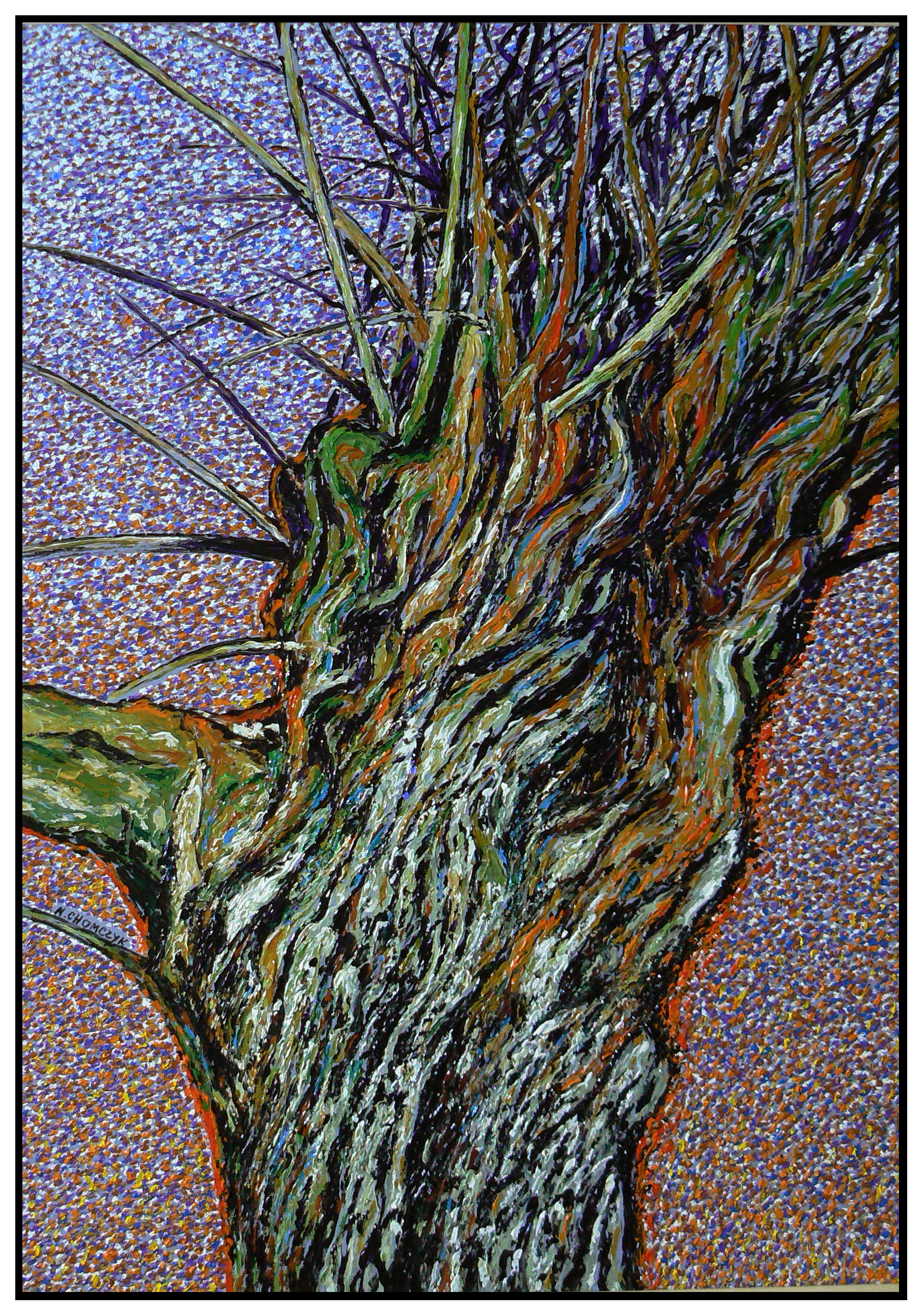 Na obrazie widzimy niezwykle ekspresyjny pień drzewa, który zdaje się ożywać dzięki gęstwinie kolorowych płomieni. Odcienie zieleni i brązu, osadzone na teksturze pełnej detali, splatają się jak nieregularne fale. W tle tło niemalże hipnotyczne z drobnymi punktami fioletu i pomarańczy, które tworzą jakby dynamiczny pattern. Kompozycja jest zaskakująco dynamiczna i chaotyczna, budując atmosferę pełną tajemnicy i siły natury. Artysta posługuje się techniką pointylizmu, co dodaje głębi i trójwymiarowości. Nastrój, jaki emanuje z dzieła, to mieszanka niepokoju z fascynacją. Czujemy jakby drzewo było świadkiem wielu historii, każdy sęk skrywający sekrety minionych lat. Obraz tętni życiem, niemalże przywołując obrazy z dzieciństwa pełne bajkowych lasów. Malarskie pociągnięcia są dynamiczne i pełne energii. Można niemal usłyszeć szelest liści podczas wiatru. A 7-letnie dziecko mogłoby powiedzieć: „To drzewo wygląda jak smok!” Patrząc na to, jak artysta bawi się światłem i cieniem, zastanawiam się nad trwałością natury. Wywołuje to we mnie tęsknotę za niezmiennością i stabilnością, którą często znajduję w przyrodzie. To „amazing” jak takie proste elementy mogą stworzyć tak głęboką emocjonalną reakcję.