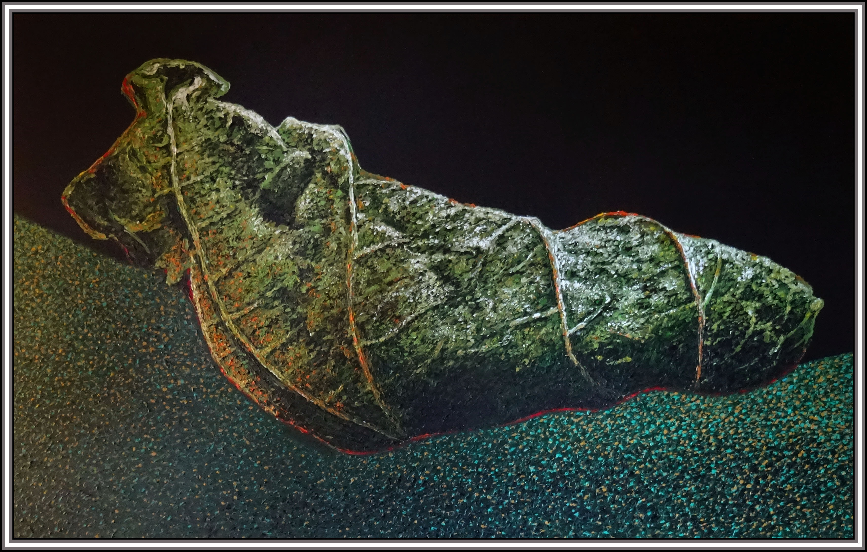 Obraz ukazuje niezwykły, przypominający kokon kształt, zawieszony w przestrzeni o ciemnym tle. Wzór jest złożony z odcieni zieleni i pomarańczu z delikatnymi detalami, które układają się w skręconą formę, jakby coś w środku miało zaraz ożyć. Artysta zastosował kontrasty kolorów, które przyciągają wzrok i nadają głębi dziełu. Technika użyta na płótnie to, jakby, połączenie impresjonizmu z abstrakcją, dające wrażenie ruchu i przemiany. Patrząc na to dzieło, można poczuć tajemniczą atmosferę, która intryguje i budzi ciekawość. Obraz wydaje się zatrzymany w czasie, jakby uchwycił moment przejścia. Dla mnie to jak magiczne zaklęcie, które przenosi do świata marzeń. Wow! Możesz poczuć, jak napięcie narasta, czekając na coś nieuchwytnego. Ten nastrój budzi refleksje na temat natury przemiany. Obraz może wywołać w odbiorcy gamę emocji – od zaskoczenia po zachwyt. I to jest właśnie jego "magic". Złożoność techniki oraz sposób przedstawienia kształtu sprawiają, że trudno oderwać od niego wzrok. I wiesz co? Wyobraźnia może w tym rodzinnym, niemal kosmicznym klimacie szaleć na całego.