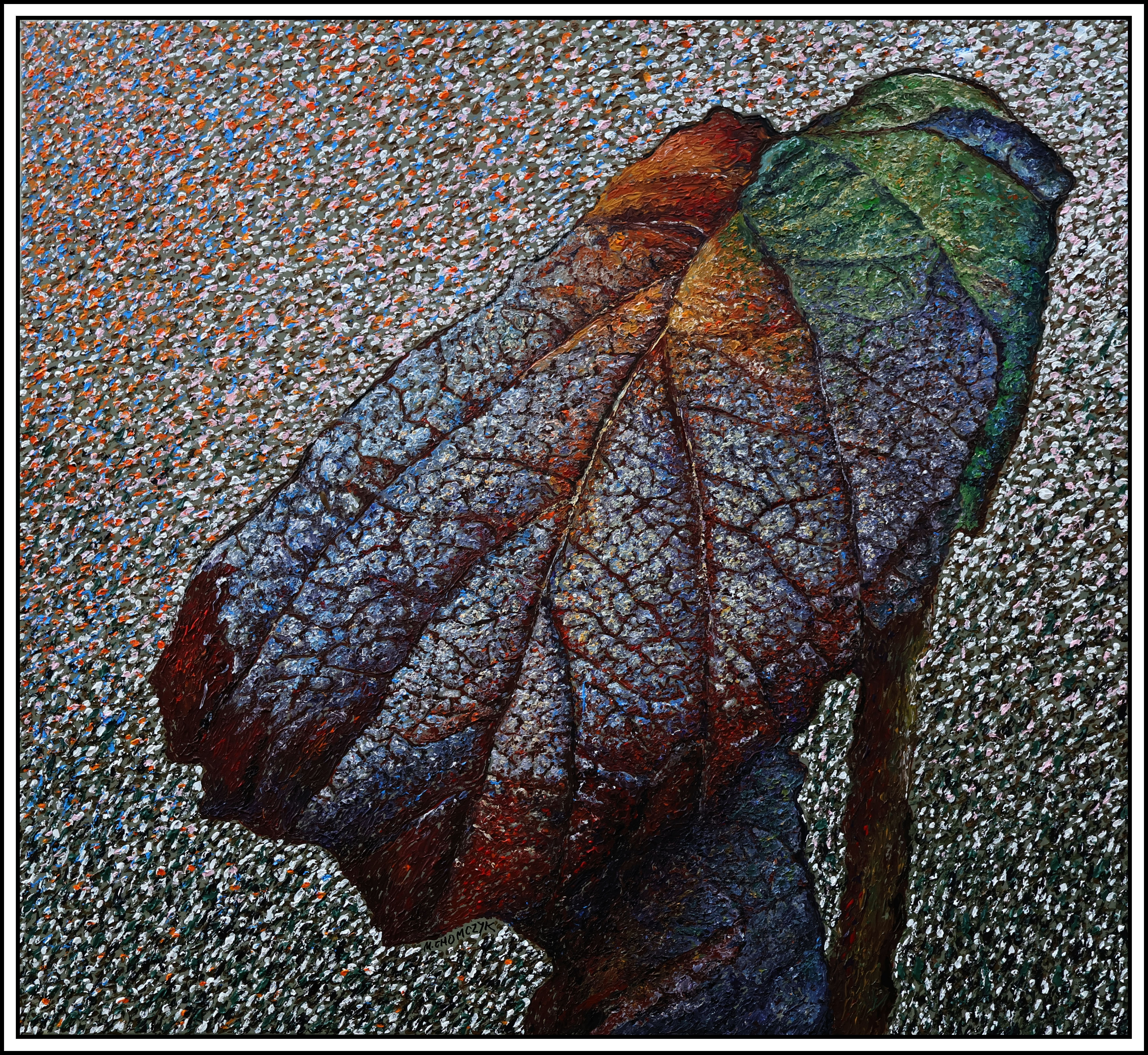 Na obrazie widzimy duży, teksturowany liść, który zdaje się unosić na tle pełnym drobnych, kolorowych kropeczek. Kolory liścia to mieszanka różnych odcieni – od intensywnej zieleni, przez ciepłe brązy, po delikatne przebłyski czerwieni. Tło, usiane nieustannie zmieniającymi się punktami kolorów, nadaje dziełu dynamiki. Wygląda, jakby ktoś rozsypał confetti. Kompozycja skupia się na centralnym elemencie, co przykuwa wzrok i sprawia, że cała reszta staje się tylko tłem dla tej naturalnej formy. Nie sposób nie poczuć się jakbyśmy patrzyli na jakąś scenę z bajki. Obraz emanuje spokojem i jednocześnie tajemniczym urokiem. Styl artysty przypomina technikę pointylizmu, wykorzystując drobne, precyzyjne punkty, które tworzą harmonijną całość. Te drobne punkciki są jak kropki z mojego zeszytu, które rysuję, gdy się nudzę. Ta praca może wywoływać u widza uczucie zachwytu nad detalem natury, ale też pewnego rodzaju nostalgii za ulotnym pięknem przyrody. Widz może się zastanawiać nad przemijaniem, nad tym, jak piękno liścia kontrastuje z chaotycznym tłem – niczym porządek w chaosie. Artysta stworzył coś, co przypomina mozaikę, w której każdy element jest równie ważny. Mimo że liść jest suchy i pomarszczony, tchnie w nim życie, które artysta uchwycił z niezwykłą dbałością. Te kolory są naprawdę "amazing", jakbyśmy spojrzeli przez kalejdoskop. Zastanawiam się, jakie historie mógłby opowiedzieć ten liść, gdyby potrafił mówić.