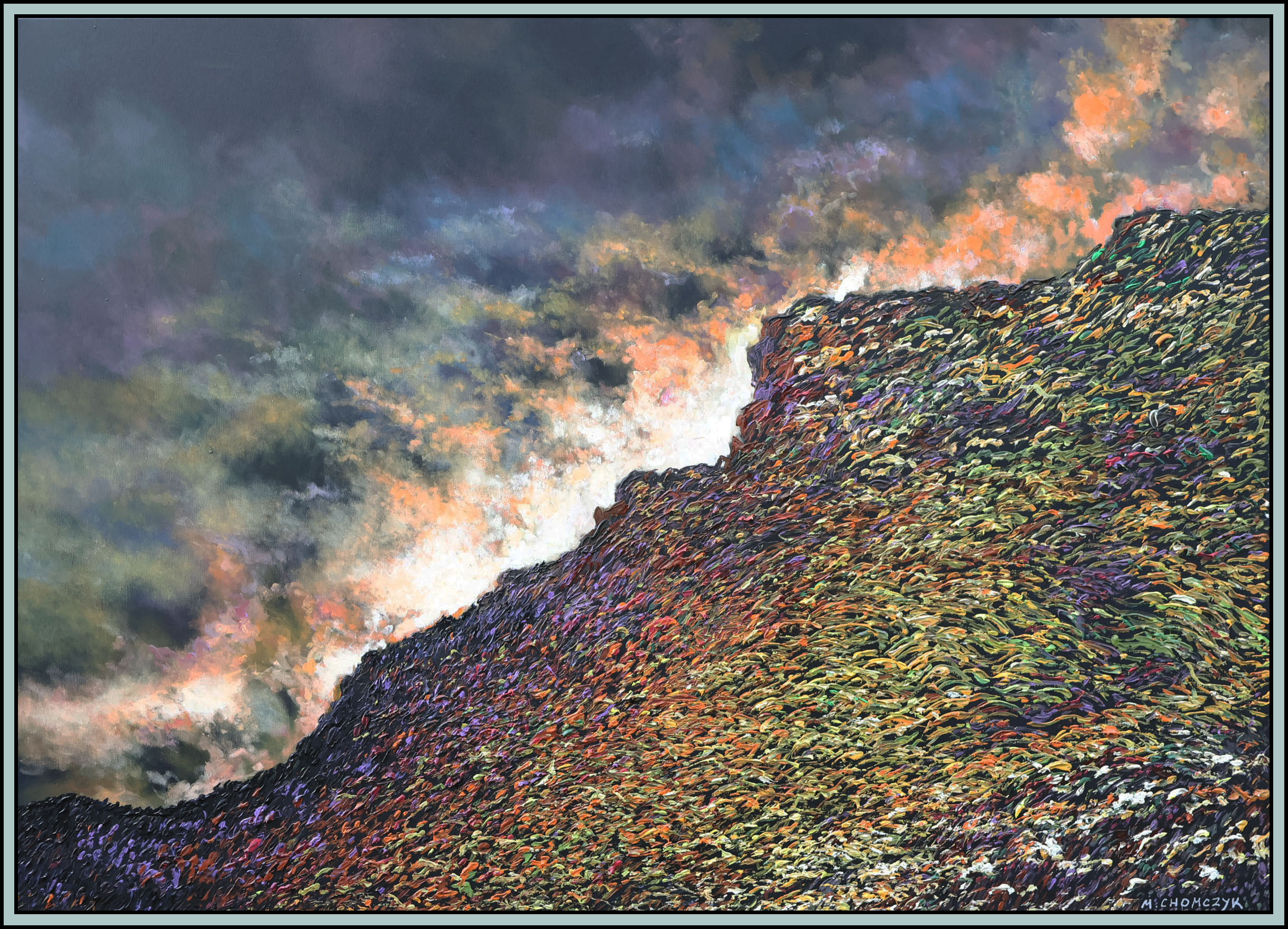 Ten obraz to prawdziwa eksplozja kolorów i emocji. Lewa strona płótna emanuje wibrującymi odcieniami zieleni, błękitu i fioletu, które przechodzą w bursztynowe odcienie na prawo. Górska forma, namalowana za pomocą chaotycznych, wirujących pociągnięć pędzla, przypomina mozaikę złożoną z tysięcy dynamicznych elementów. Niebo nad tym wszystkim jest jakby wzburzone, z ciemnoszarymi chmurami odbijającymi światło zachodzącego słońca. Atmosfera obrazu jest dramatyczna, pełna energii i ruchu, jakby nad miejscem przetoczyła się burza, pozostawiając po sobie tę wybuchową mieszankę kolorów i emocji. Styl artysty można by nazwać impresjonistycznym z nutką abstract art. Dynamika pociągnięć pędzla i mieszanie barw przywodzą na myśl największych mistrzów pędzla. Obraz wywołuje u widza mieszankę zachwytu i lekkiego niepokoju. To trochę jak rollercoaster dla oczu, zmuszający do refleksji nad potęgą natury i jej nieprzewidywalnością. Moją pierwszą reakcją było "wow", a potem zaczęłam się zastanawiać, co tam się dzieje. Ciekawostka: kolorystyka tego dzieła może skłonić niektórych do zastanowienia się, czy to sunrise czy sunset. Po prostu niesamowite! Dla mnie to tak, jakby artysta złapał moment pomiędzy dniem a nocą. Wyobrażałem sobie, że te kolory to koncert na niebie, gdzie każda barwa śpiewa swoją pieśń. Po prostu magiczne.