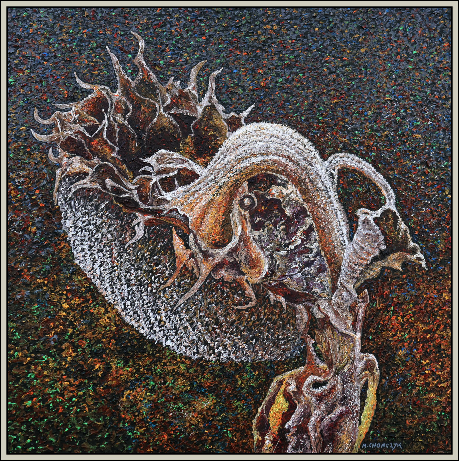 Na obrazie widać wielki słonecznik jakby zgięty w pół, ciężki od czasu i farby. Tło jest ciemne, granatowo czarne, całe w drobnych plamkach zieleni, rdzy i pomarańczu, jak rozsypane iskry. Płatki są poskręcane, szare i białe na krawędziach, a środek ma brązy, czerwienie i złoto. Kompozycja prowadzi wzrok po łuku, od głowy kwiatu do łodygi, która wygląda jak żyła. Technika gruba, impasto, gęste faktury aż chce sie dotknąć. Nastrój jest trochę jesienny i melancholijny, ale też uparty. To jest duży kwiatek i on mi się podoba. Czuję w tym obrazku walkę i cichą dumę, taki brave spokój mimo przemijania.