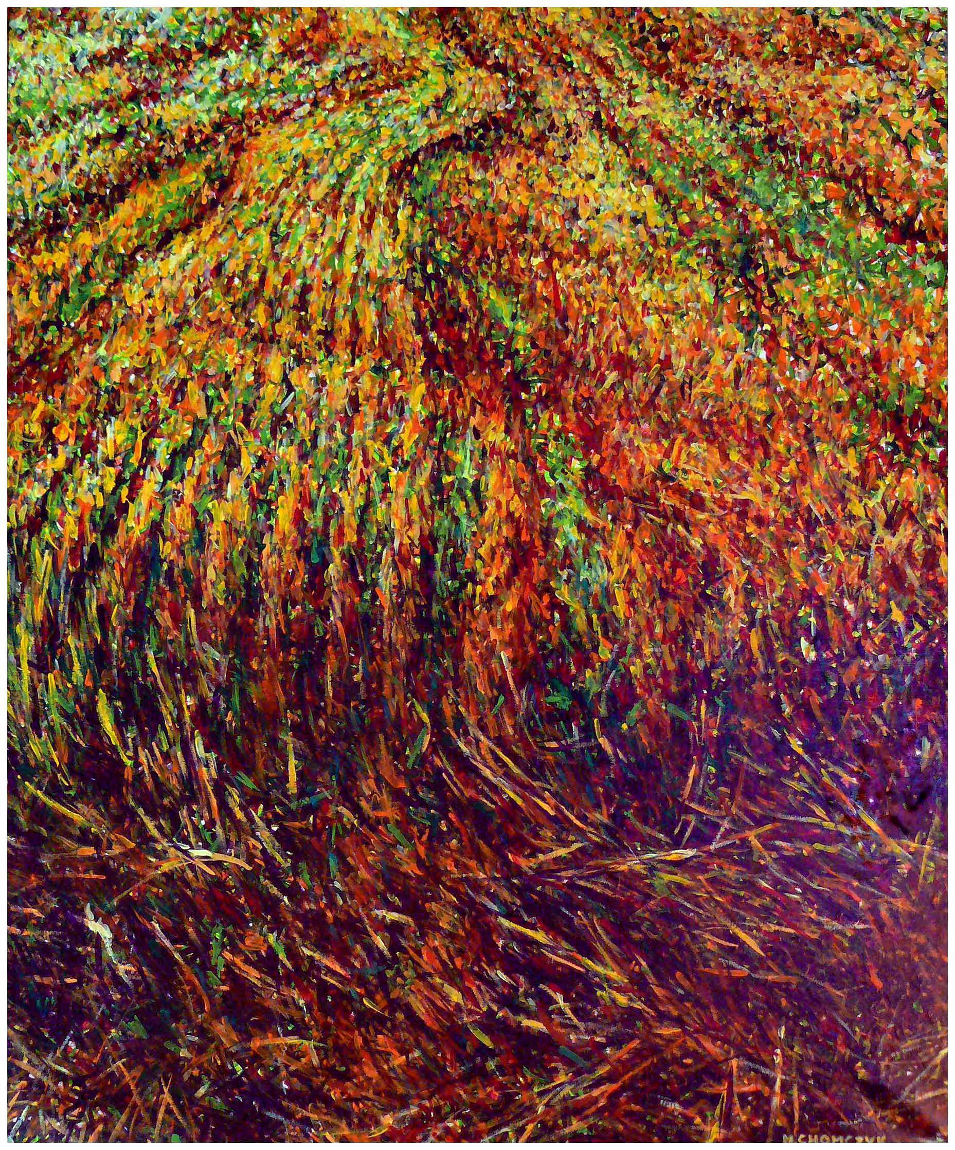 Ten obraz to prawdziwy festiwal barw, gdzie pomarańcz, zieleń i czerwień wibrują razem jak na szalonej dyskotece natury. Krótkie, dynamiczne pociągnięcia pędzla tworzą morską strukturę, niczym fale na polu trawy, porwane wiatrem. Atmosfera jest pełna energii i ruchu, jakby każdy kawałek płótna chciał skakać z radości. Obraz emanuje ciepłem lata, czuć tu swobodę i beztroskę. Artysta korzysta z techniki pointylizmu, co dodaje dziełu lekkości i wrażenia ruchu. To jak patrzenie przez kalejdoskop, gdzie każdy punkt i plama łączą się w coś magicznego. Ten obraz wywołuje uczucia spokoju, ale też podekscytowania. Jest taki moment, kiedy dzieciak mówi: "Patrz, trawa tańczy!" – i to dokładnie to możesz tu poczuć. Odbiorca może mieć różne interpretacje. Może zobaczyć w tym zachwycie naturę, nieskończoność życia. Albo pomyśleć o fartownym dniu spędzonym na łące. Obraz ma niesamowity "Wow effect", przez co staje się wyjątkowy. To nie tylko sztuka do podziwiania, ale i do przeżywania.