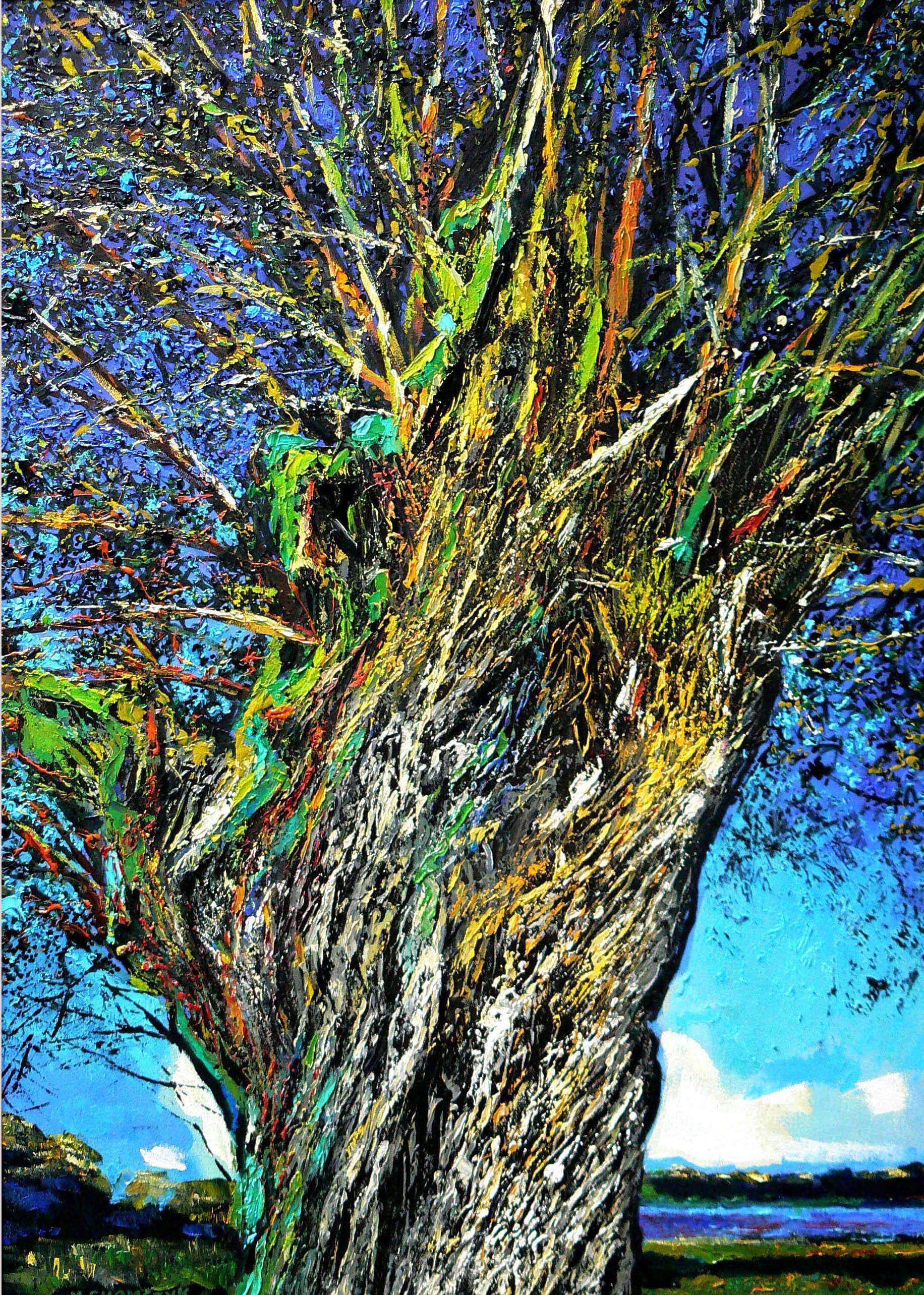 Obraz przedstawia porywający widok na masywny pień drzewa, które zdaje się rosnąć niemal w niebo. Kolory eksplodują przed oczami. Niebieskie i zielone odcienie tworzą wyrazisty kontrast z brązowymi i złotymi smugami pnia. Wszystko wydaje się płynne i dynamiczne, jakby natura tańczyła na płótnie. Gałęzie rozciągają się w górę, rozgałęziając się w chaosie i harmonii jednocześnie, tworząc kompozycję pełną ruchu i energii. Atmosfera obrazu jest pełna życia, a jednocześnie emanuje spokojem. Widać tu technikę impasto, gdzie grubo nakładana farba nadaje teksturę i głębię. Widz może poczuć się jak w pełni lata, słysząc jedynie szelest liści. Obraz prowokuje pytanie: co widziało to drzewo przez lata? Jakie sekrety skrywa jego chropowaty pień? Mój młodszy brat powiedziałby: "To drzewo wygląda jak brokuł!". Patrząc na ten obraz, odczuwam nostalgię za dzieciństwem. Wyraziste "vibrancy" kolory przyciągają wzrok i chwytają serce. Naprawdę, trzeba to zobaczyć na własne oczy.